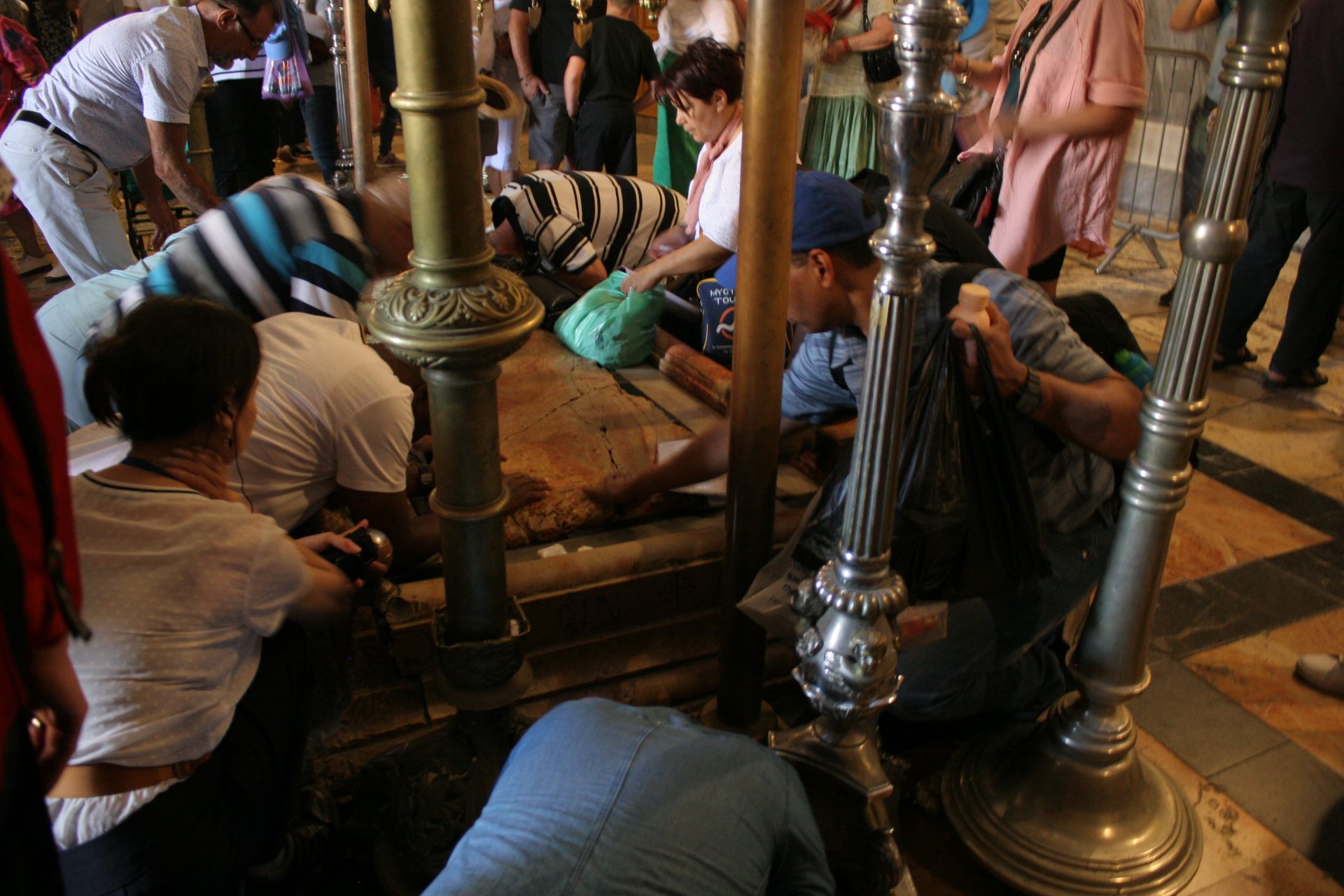 聖墳墓教会の中にある聖油台はひざまずき、触れる信者でいっぱい
