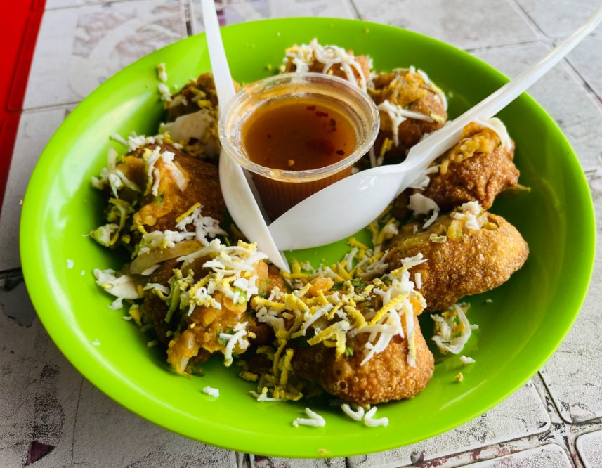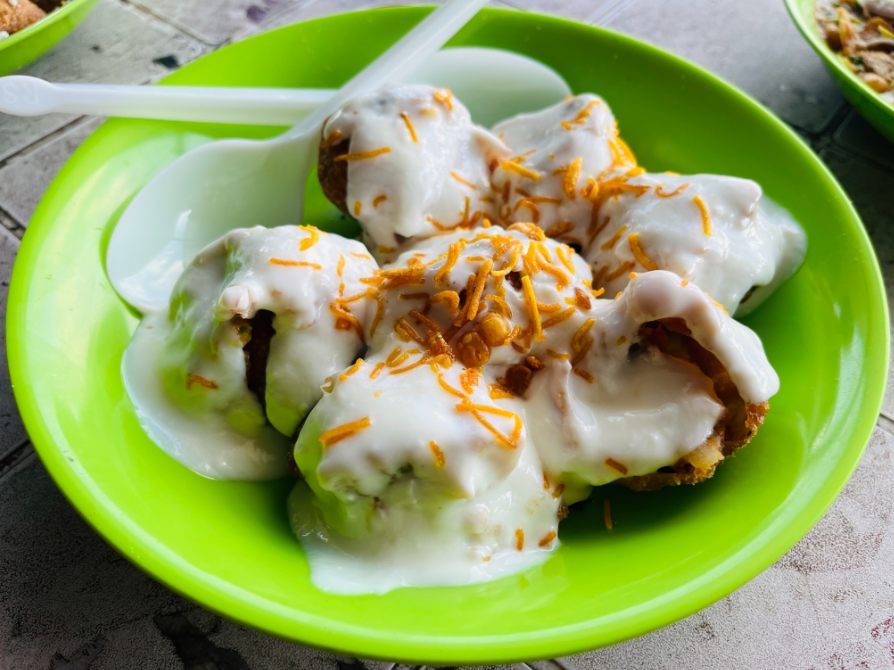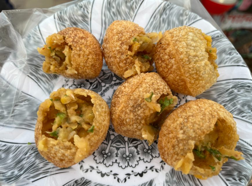 最初にご紹介する「○○プーリー」は、フチカです。フチカは名前に「プーリー」という語はつかないものの、プーリーを使ったスナックのひとつです。ジャガイモ、豆などを手のひらサイズのプーリーに詰めて、玉ねぎ、ゆで卵、コリアンダー、青唐辛子などをトッピングし、すっぱ辛い(そして、ちょっと甘くもある)スープをかけて食べます。