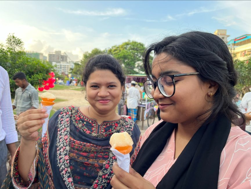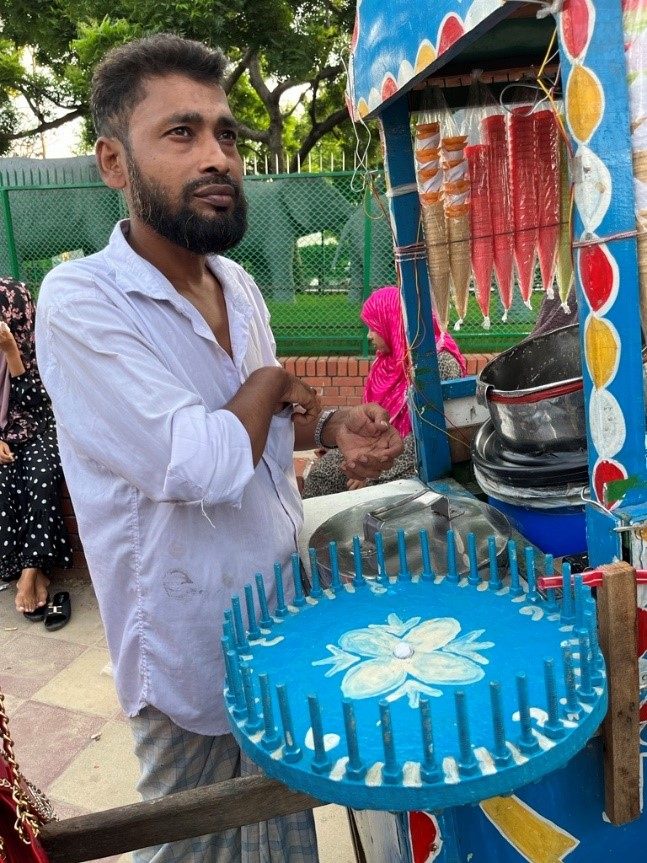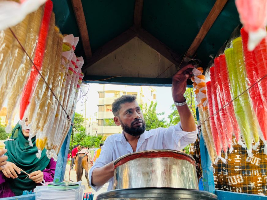 現地スタッフのおすすめは、アイスクリーム。大きめの氷が入ったシャリシャリのシャーベットのようなアイスは1本10タカ(約13円)。ルーレット状のクジにあたると、もっとたくさん食べられるとか。