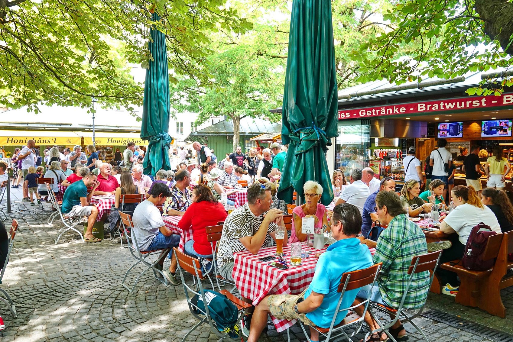 ヴィクトアーリエンマルクトは、野菜やチーズ、ワインなどの食材店や、広いビアガーデンをはじめ、南ドイツ名物の飲食店が合わせて100点以上も並ぶ、ミュンヘン最大の常設青空市場。のんびり歩くとのどかなドイツのいなかにいるようです。飲食店はセルフ方式なので、注文は指差しでOK。店舗が多すぎて、どの店にするか迷ってしまいますが、おすすめショップの情報も掲載しています。ドイツのビアガーデンの利用方法も詳しくガイドしました。
