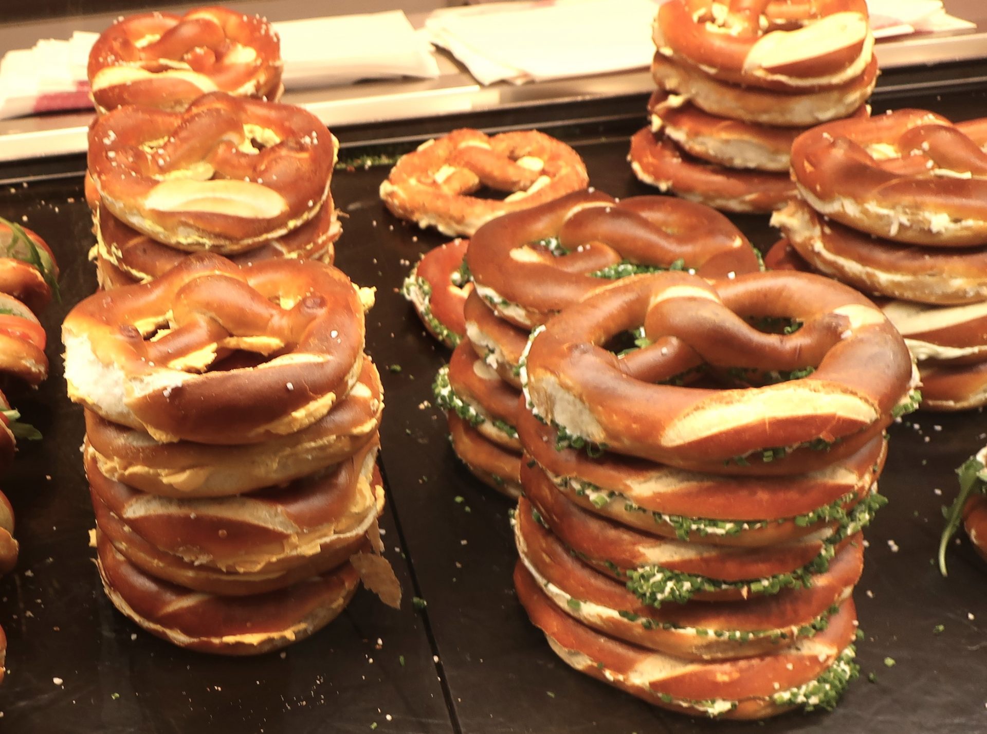 日本ではほとんど扱う店のないブレーツェルというパンは、南ドイツに行ったら必ず食べたいもののひとつ。そのまま食べてもいいですが、横にスライスしてバターをたっぷり塗ったものが人気です。ブレーツェル専門店のブレーツェリーナではハムやチーズを挟んだものなどバリエーションが豊富。ブレーツェルは固くなるのが早いので、買ったらなるべくすぐに食べるのがおいしく食べるコツ。町で食事をする時間がなかった時など、移動中の列車の中で食べるとおいしさ倍増です。