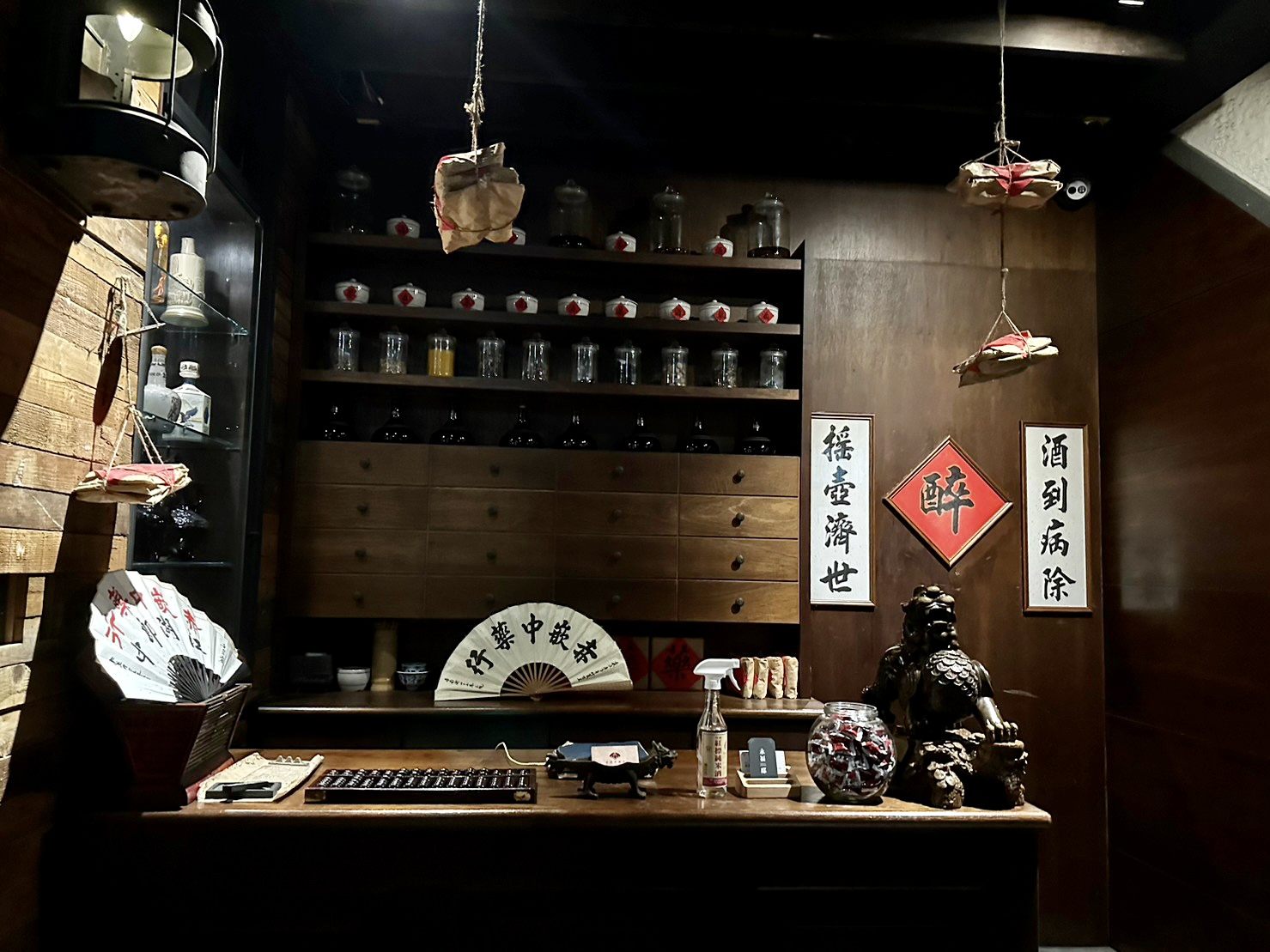 漢方薬局をイメージした店内は随所にこだわりが感じられます。入口の奥にバーへ向かう秘密のドアがあるなど、ワクワクする仕掛けも。