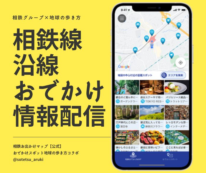 相鉄ホールディングス株式会社が今春より配信している「相鉄おでかけマップ Powered by Beatmap」。アプリ内の地図上から、SNSで話題になった相鉄線沿線の店舗や施設を簡単・お手軽に検索できます。現在配信中の情報では、相鉄グループからの配信に加えて、地球の歩き方も協力をしています。