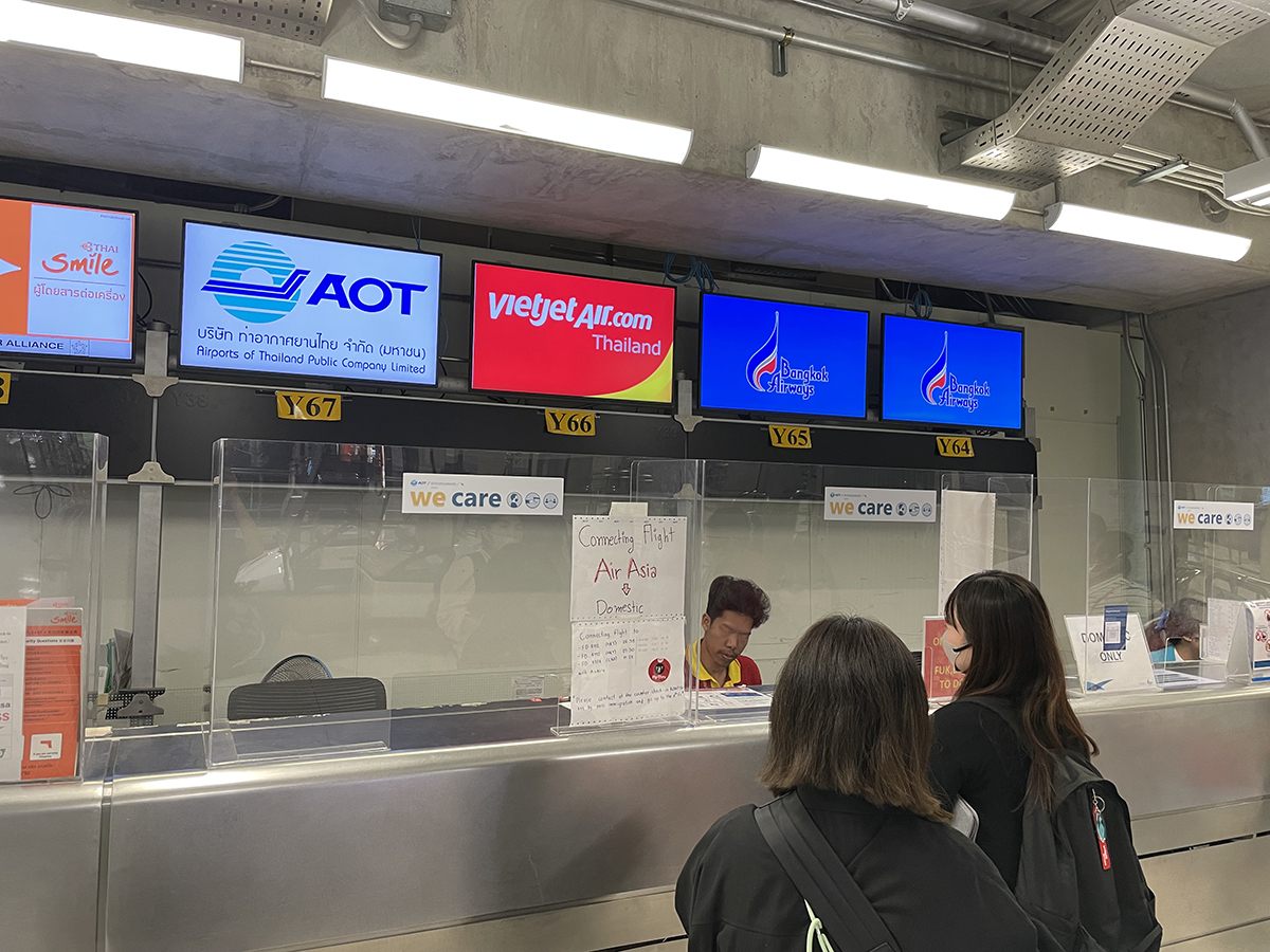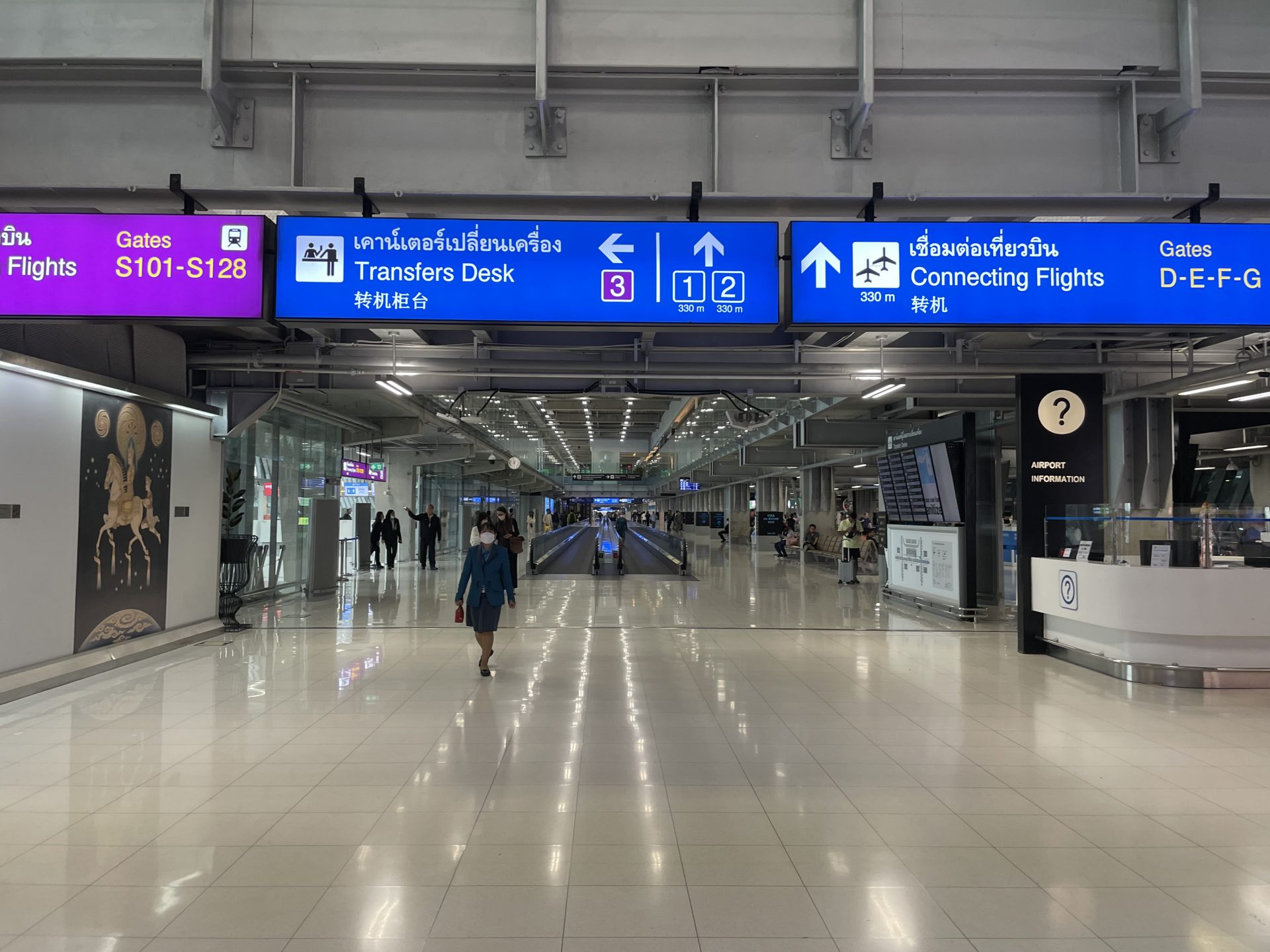 約5時間半のフライトを経てバンコクスワンナプーム空港に到着。到着後は「Transfers Desk」の案内にそって進み、乗り継ぎ専用のチェックインカウンターへ向かいます。福岡でプーケットまでのチェックインは済んでいるので、ここでは搭乗ゲートや座席が書かれた搭乗券を受け取るのみ。列にも並ぶことなく簡単に乗り継ぎ手続き完了。