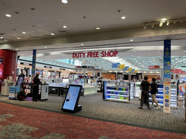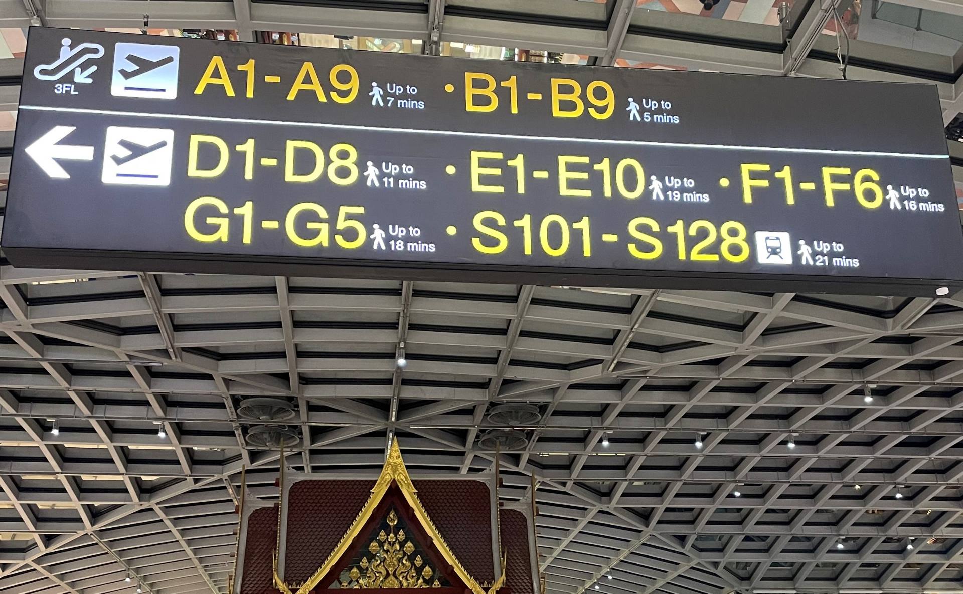 あとは搭乗時間までに搭乗ゲートに向かうのですが、バンコクスワンナプーム空港の敷地面積は成田空港の3倍もある相当な広さなので、移動時間の確認は必須です。案内表示に各ゲートまでの移動時間が書かれているので、それを目安にし、時間に余裕があってもなるべく搭乗ゲート近くの土産店やカフェなどで時間をつぶすことをおすすめします。