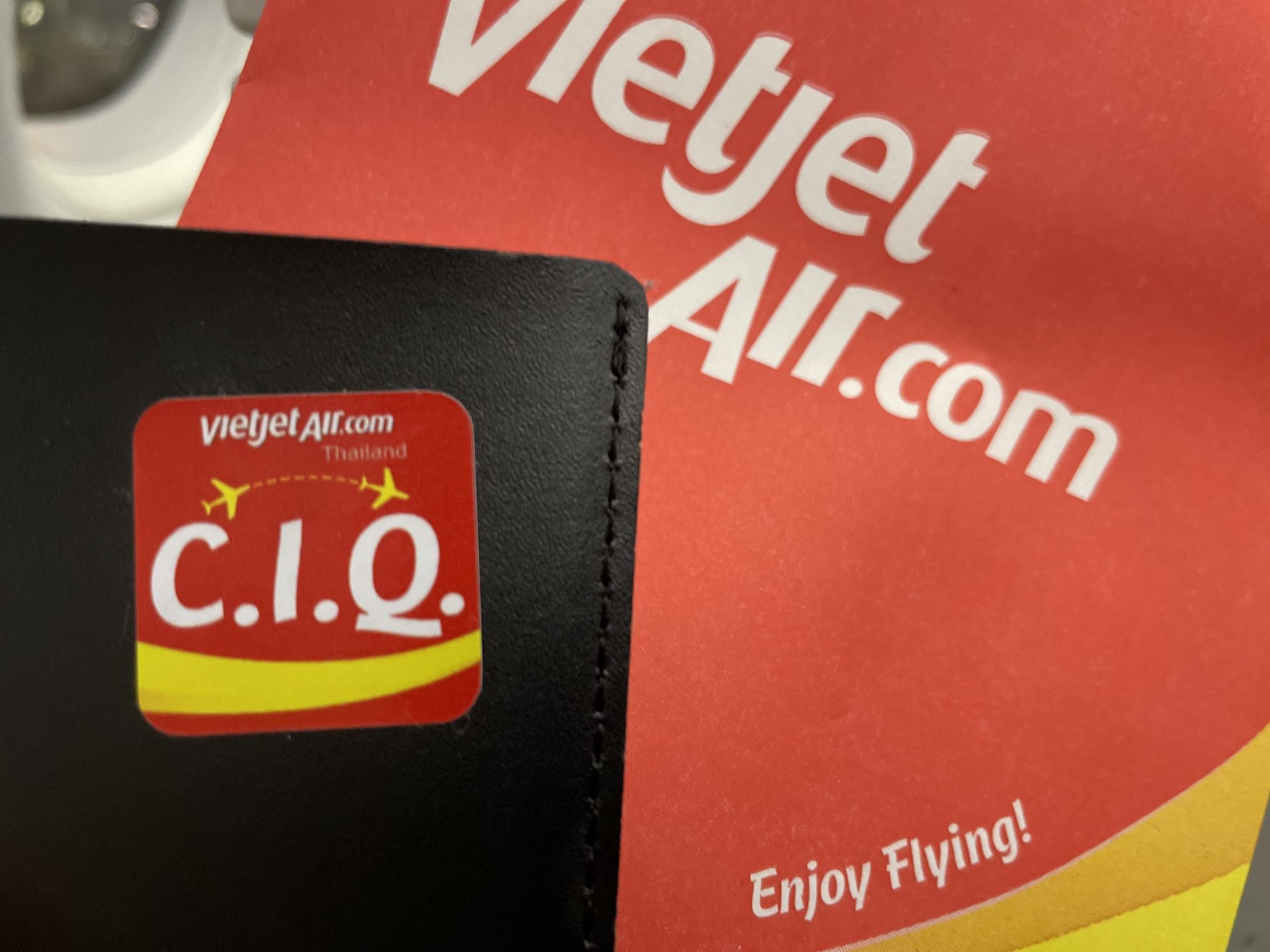チェックイン時に搭乗券と一緒に「C.I.Q.」と書かれたシールを受け取ります。これは「Sky ConX」利用者であることを係員に知らせるためのもので、胸元など見えるところに貼って搭乗します。プーケット到着までなくさないように気をつけましょう。