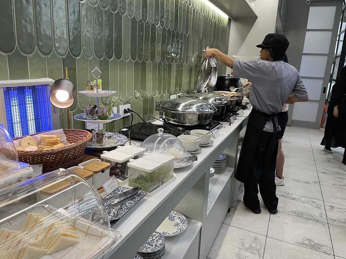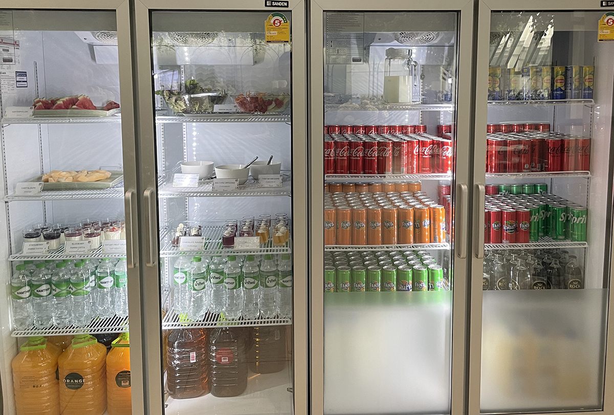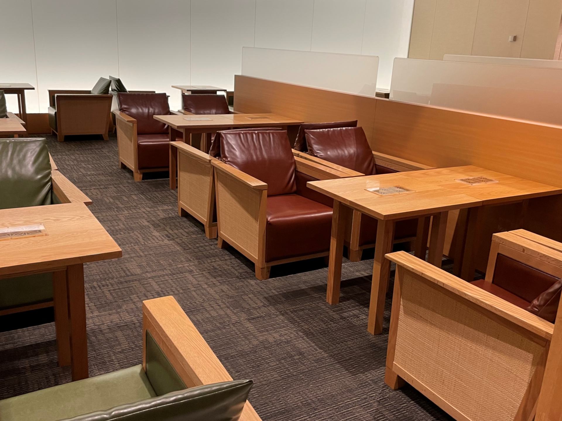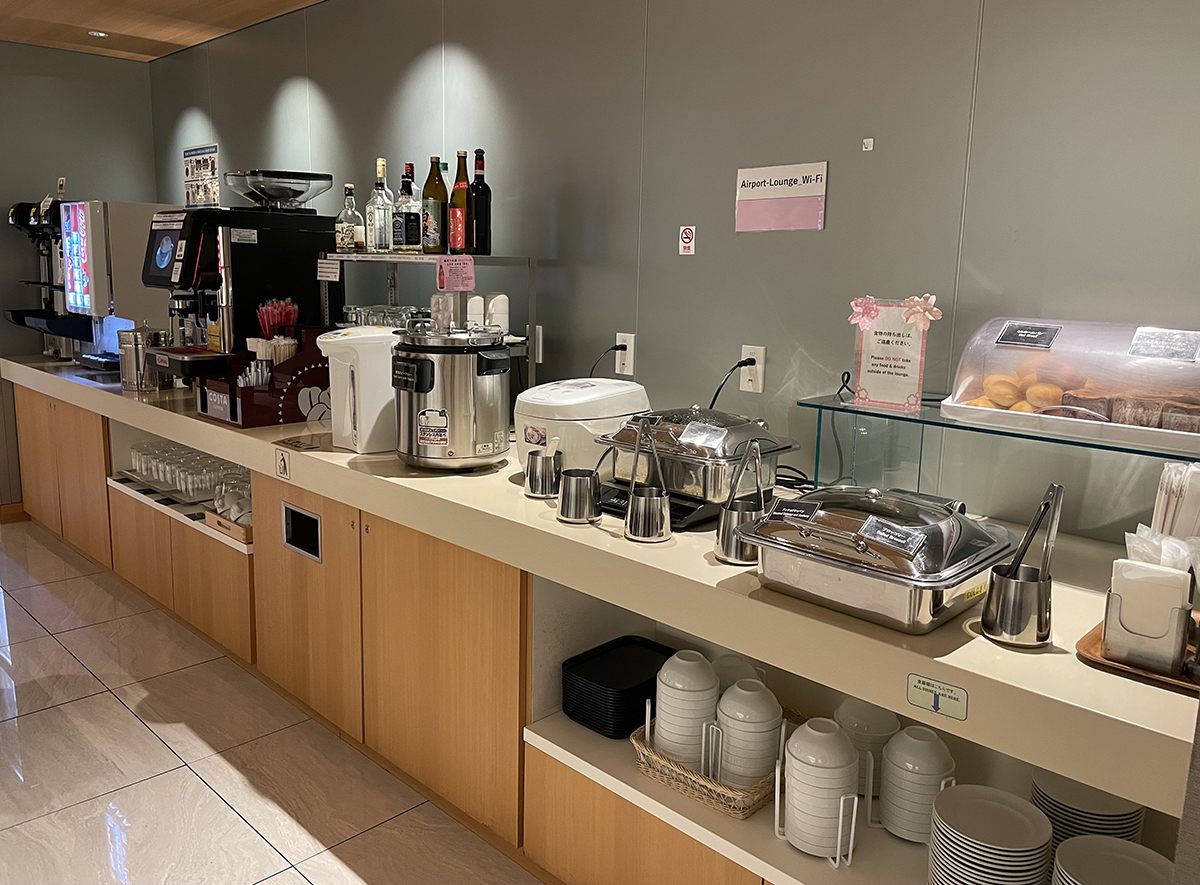 オフィスの応接室のような雰囲気でとても清潔感があり、仕切りもあって周りを気にせずくつろいだり仕事をすることができます。ドリンクコーナーにはカフェ、ソフトドリンク、アルコール類、軽食はパンやフルーツ、スイーツのほか、カレー、焼きそばなど温かい食事の用意もあり、フライト前の小腹を満たすのに十分なラインナップです。