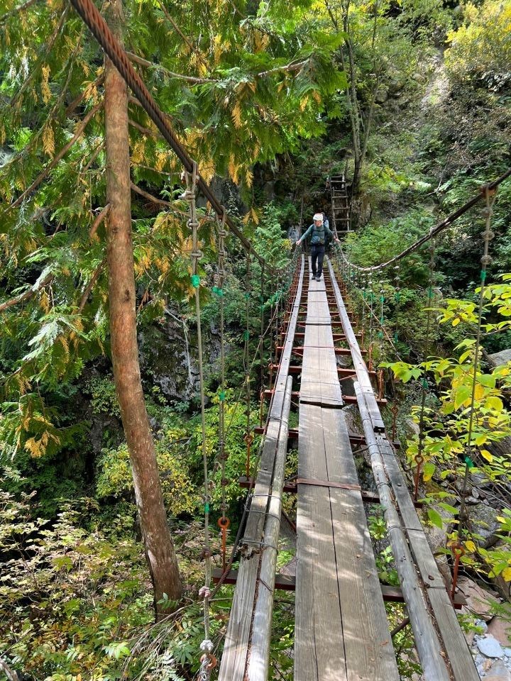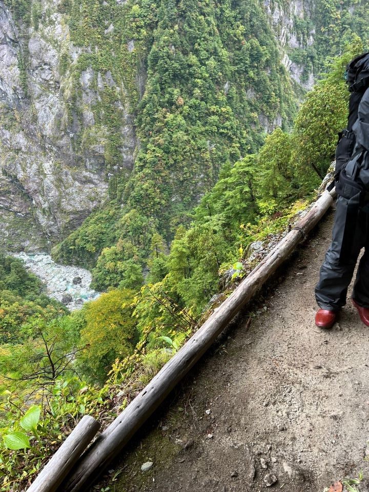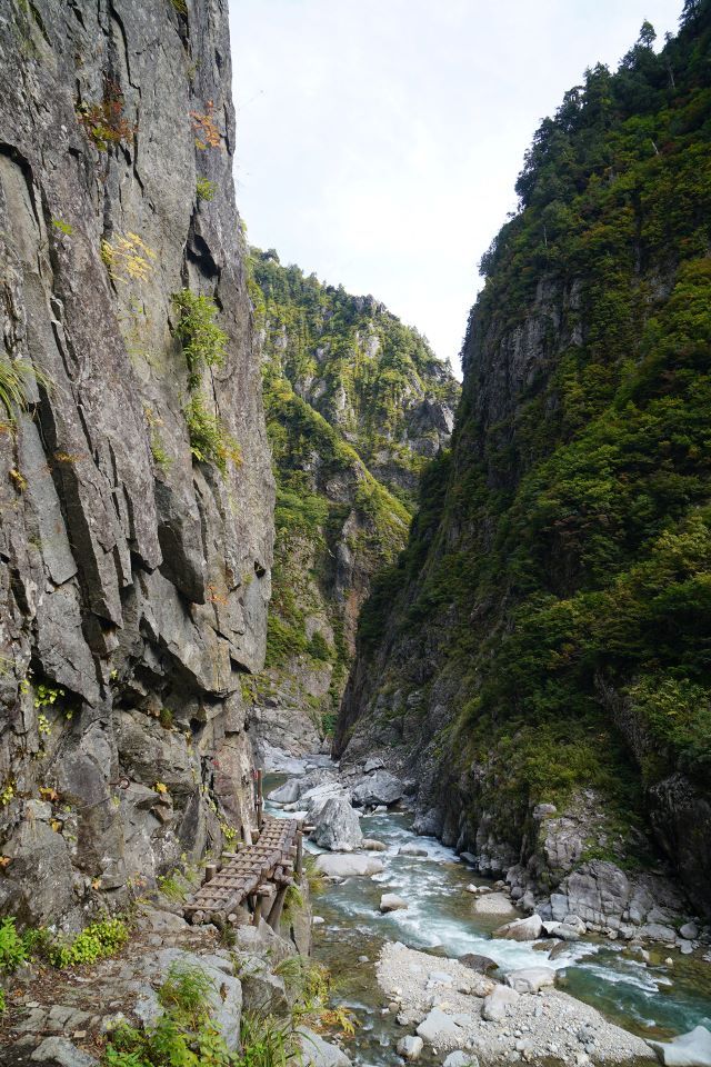 この登山道は今日の目的地である阿曽原温泉の方たちによって整備されているそうです。丸太で整備された道の上を歩くのですが、この橋をどうやって建てたのだろう?と、過酷であろうルート整備に感謝しながら進みます。