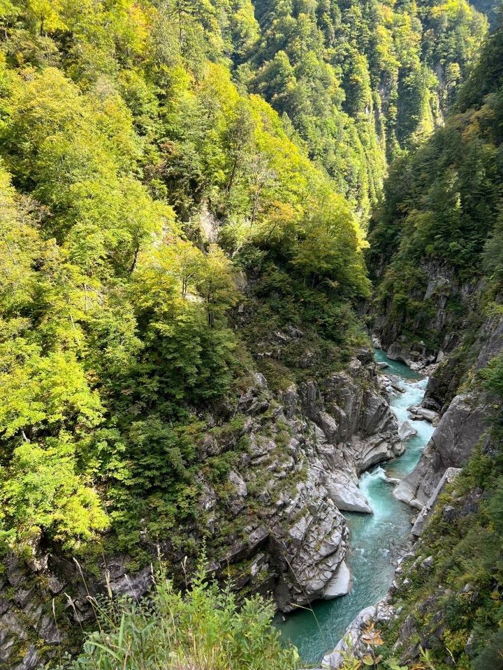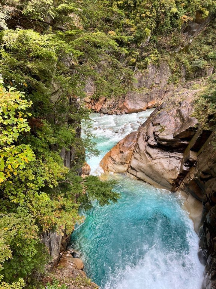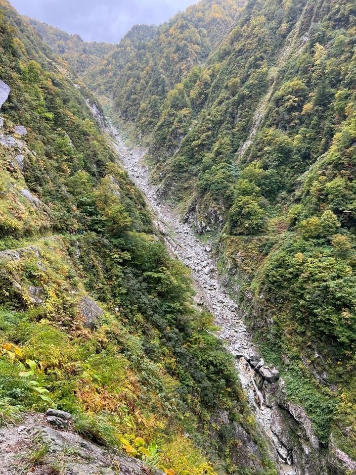 黒部宇奈月キャニオンルート記事の取材が決まった時、この道ができるきっかけになった登山道・下ノ廊下もセットで歩こうと決めていました。23年は猛暑の影響からか紅葉の始まるのが遅く、有名な三段紅葉(雪の白、紅葉の赤、低標高部の緑)を見ることはかないませんでしたが、美しい秋の黒部やスリル満点の登山道、秘境の阿曽原温泉を堪能することができました。