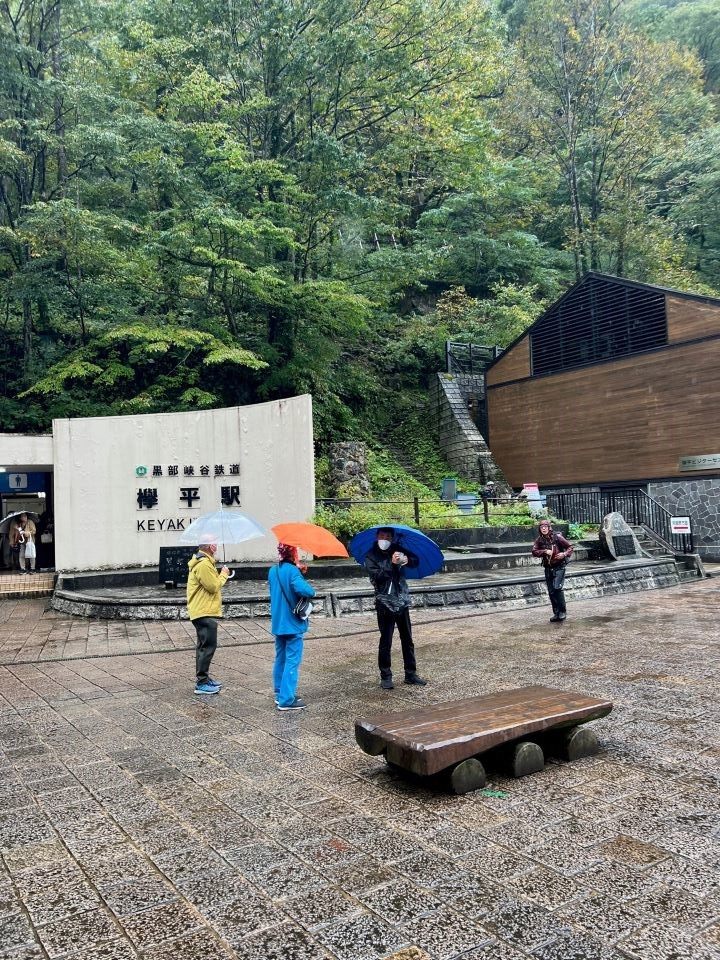 事前の予想通り、雨は朝になっても降り続いていました。晴天時の欅平のトロッコ列車は観光客優先で登山客は乗れないこともある、と聞いていた私たちですが、なんとかなるかな、と思いつつ、6時前にはそそくさと阿曽原温泉を発ち、雨の中を欅平へ急ぎます。秋の雨は肌寒く、景色も煙って良くないので、写真はあまり撮りませんでした。