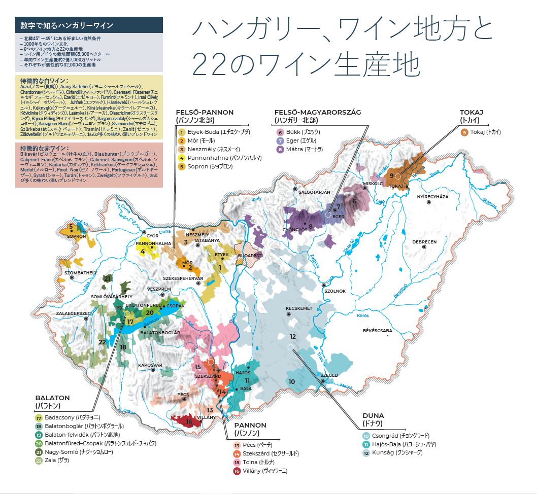 ヨーロッパのなかでもワイン生産が盛んなことで知られるハンガリー。世界三大貴腐ワインのひとつといわれ、ワイン産地全体が世界遺産にも登録されているトカイ・ワインをはじめ、国内には22の産地が点在しています。今回は、その中でもおすすめの5つのエリアを見どころとともにご紹介。現地への想いを馳せながら、各産地ならではのワインの香りや味わいを想像してみてください。
