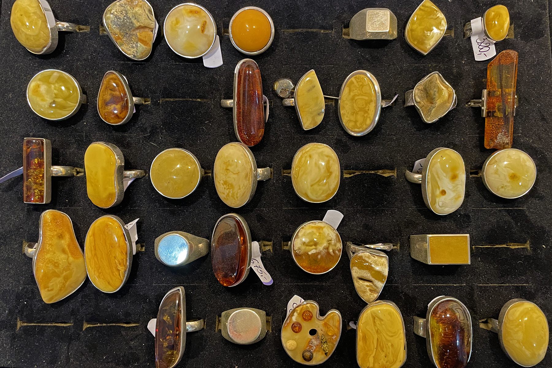 琥珀とは、木の樹脂が土の中で固まって化石化したもの。そのため、よく見ると中に虫などが入っていることもあります。色のバリエーションも豊富で、白っぽいものからかなり黒に近いものまで、実に250近い色があるそうです。指輪やネックレス、ブローチなどアイテムは多彩。日本よりかなり手頃な値段で手に入ります。
