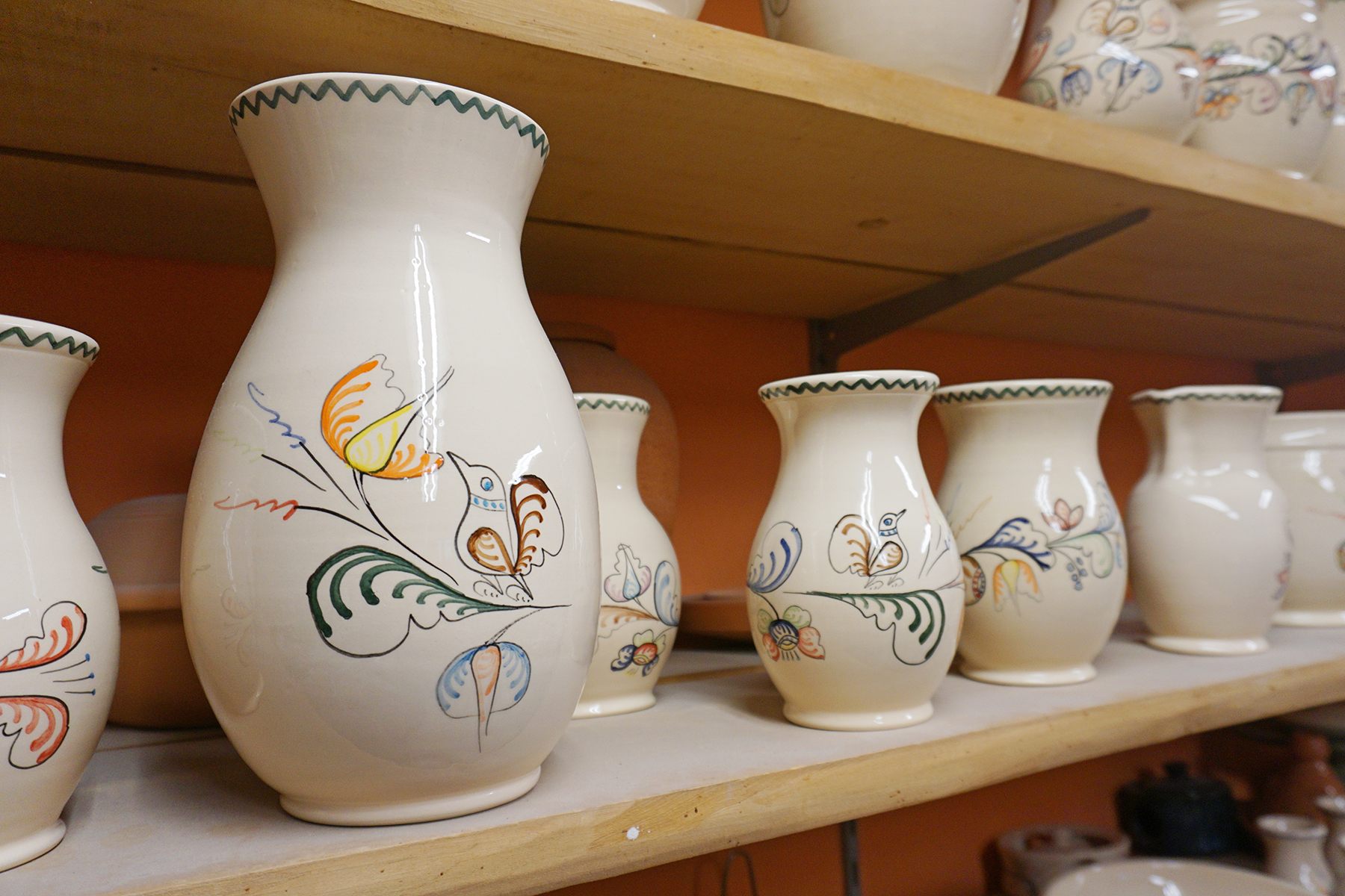 ポーランドの陶器というと、ボレスワヴィエツという町でつくられるポーリッシュ・ポタリーが有名ですが、ウォヴィチに近いボリムフの町にも伝統的なコノプチン焼きという陶器があります。200年前には20軒ほどあったという工房も、いまは1軒だけに。デザインに多用されている鳥は工房のシンボル。なんともいえない愛嬌のある表情をしていて、見ていて飽きません。模様はウォヴィチの切り絵や刺繍のデザインをモチーフにすることもあるそうです。商品は工房で買い求めることができます。