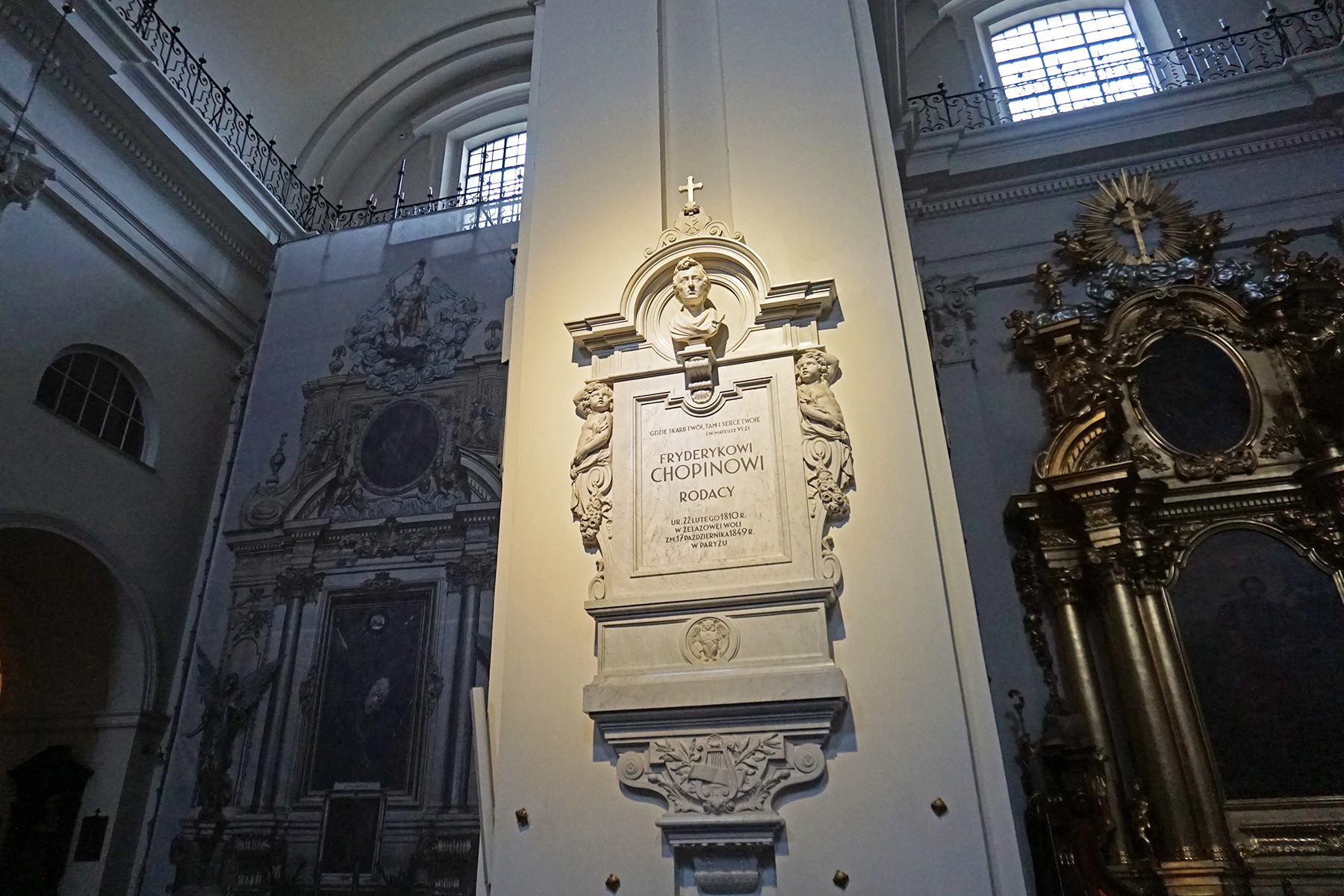 ショパンもまたポーランドを愛していました。ジェラゾヴァ・ヴォラというワルシャワから50kmほど離れた町で生まれ、生後半年でワルシャワへ移住し、20歳までワルシャワで暮らしました。しかし、出国した直後にワルシャワ蜂起が起き、戻れなくなってしまいます。39歳でフランス・パリで亡くなると、遺言に従ってお姉さんが心臓をワルシャワに密かに持ち帰りました。その心臓が安置されているのが、この教会の本堂の柱です。