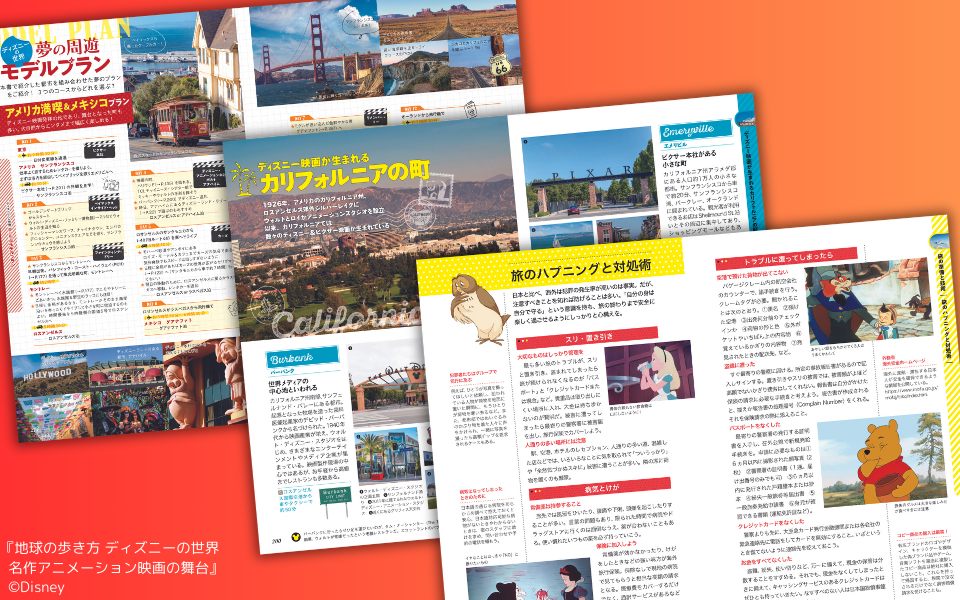 ほかにも、カリフォルニアやフロリダなど「世界のディズニーリゾート」の最新情報や、みんな大好きディズニープリンセスからは「ディズニープリンセスのプロフィール」、プリンセスのお城を断面図で解剖する「お城コレクション」、さらにディズニーやピクサーのスタジオのある町を紹介した「ディズニー映画が生まれるカリフォルニアの町」など、ディズニーファン必見のコンテンツがずらり。編集部が厳選したディズニー映画の舞台を巡る「夢の周遊モデルプラン」も、アメリカ&メキシコ編、ヨーロッパ編、アジア編と3プランをご提案し、おなじみの「旅の準備と技術」もディズニー映画の画像を散りばめてより楽しく掲載しました。ぜひ旅の計画の参考にしてくださいね。