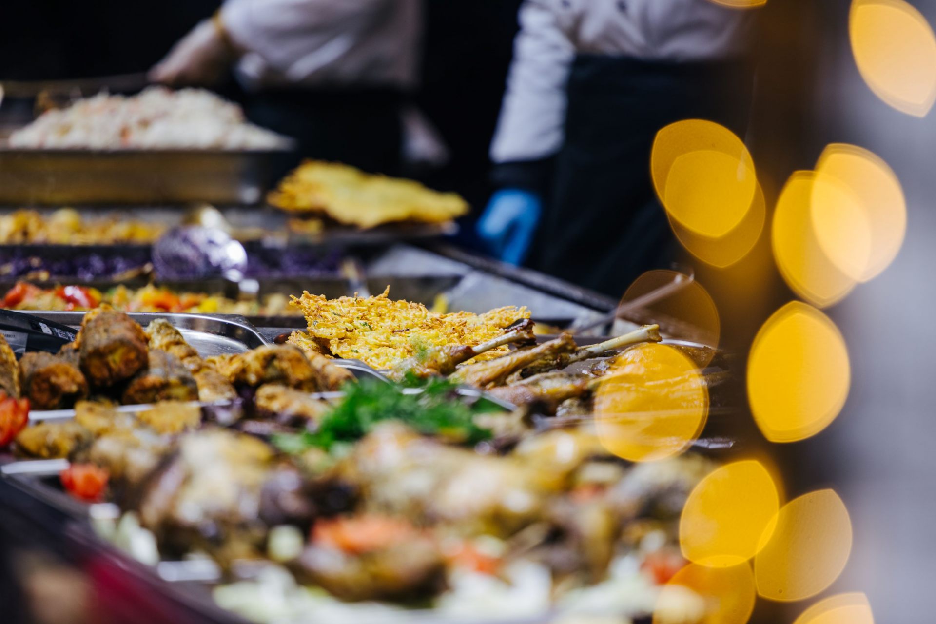 広場にはテーブルも設けられていて、クリスマスマーケットならではの雰囲気を楽しみながら屋台で購入した食事を楽しむことも。体を温めてくれるホットワインやホットチョコレートをはじめ、ハンガリーを代表するストリートフード「ランゴーシュ」や伝統菓子「クルトゥシュ・カラーチ」、ソーセージや骨付きローストポークなど、さまざまな料理が楽しめます。