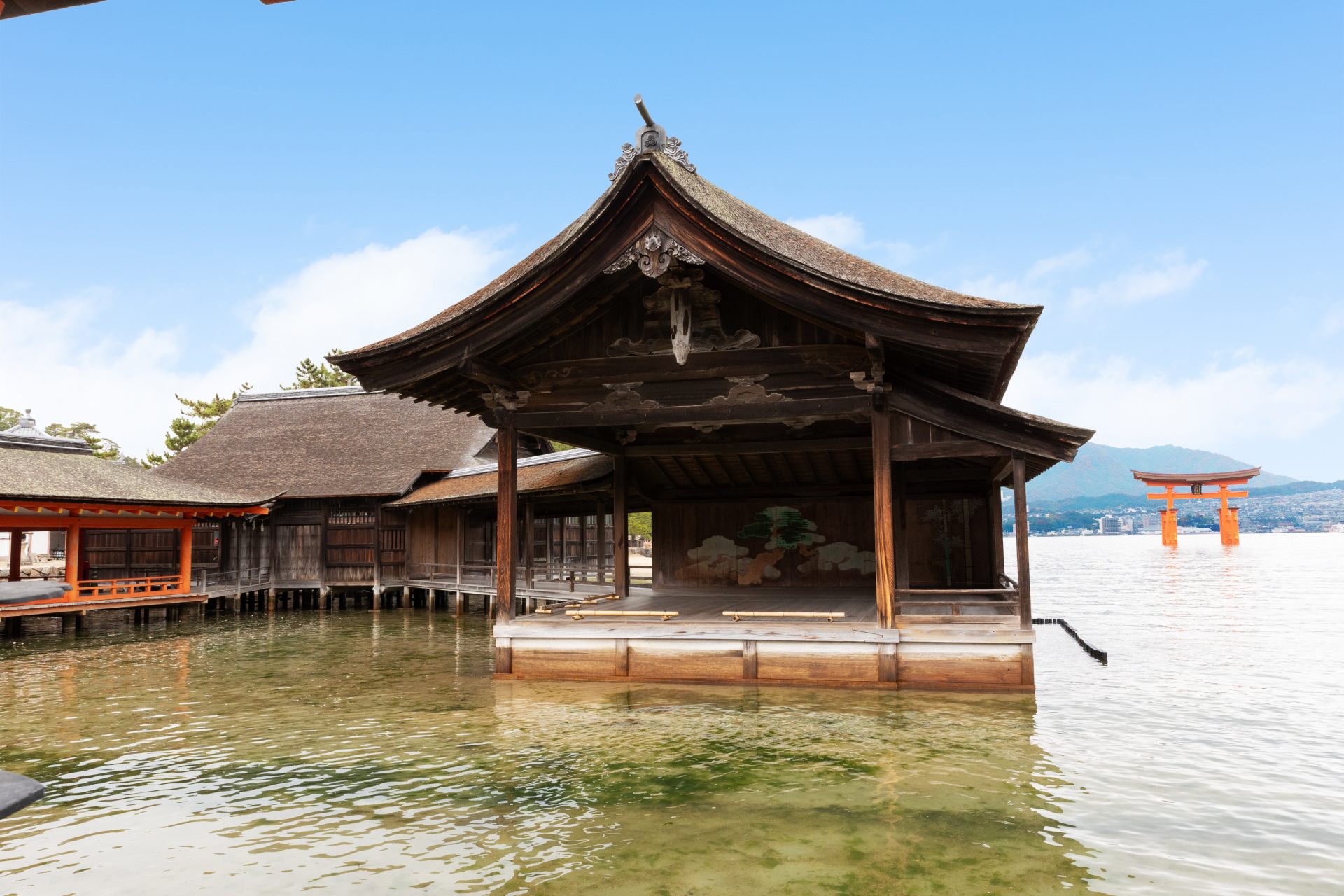 嚴島神社は593年に創建した由緒ある神社で、1996年には世界文化遺産として登録されています。なかでも特に写真に収めたいのは、2022年に改修工事が完了した大鳥居。満潮時には海中に浮かんだようにも見え、晴れた日には夕焼けに染まって美しく、そしてまた日が暮れてからライトアップされた姿も迫力満点です。大鳥居を正面に捉えることができるのは、平舞台から海の方に突き出た火焼前(ひたさき)と呼ばれる部分。さらに、西廻廊から見える能舞台越しもシャッターチャンス!参拝ルートを進みながら、さまざまな角度で大鳥居を堪能しましょう。