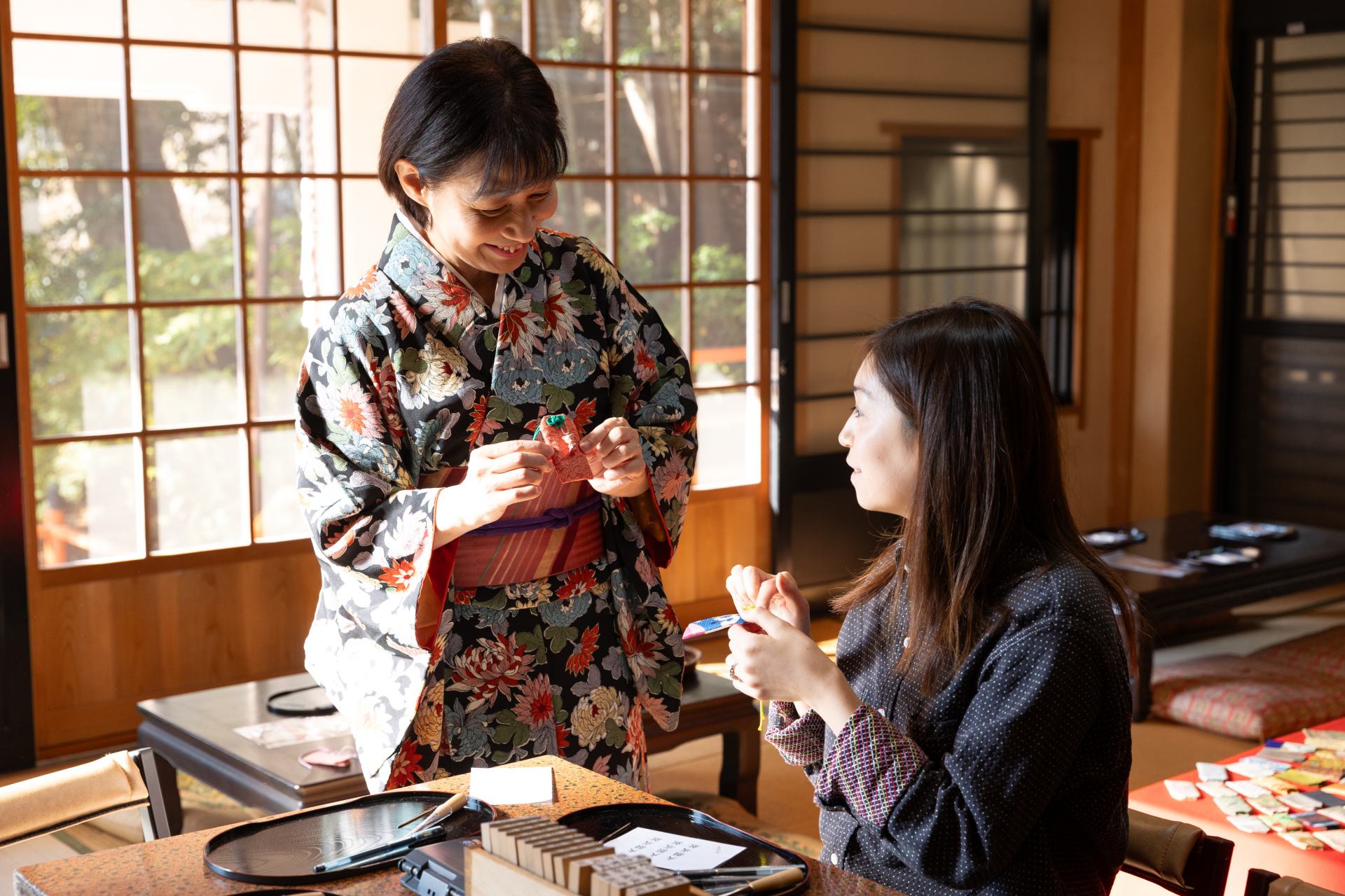 続いて訪れたのは、宮島の徳寿寺にある「okeiko japan」。好きな着物を選んで着付けてもらえる着物レンタルをはじめ、初めての人でも楽しめるミニ茶道、宮島の特産品である「しゃもじ」に文字を書くしゃもじ書道体験などができ、現在では海外からの観光客もたくさん訪れる日本文化体験施設です。今回チャレンジしたのは、ミニしゃもじのお札に願いごとを書く「お守り作り体験」。お守り袋は着物をほどいて作ったもので、常時300種類以上。10色以上の組みひもと合わせれば、自分だけのオリジナルのお守りを作ることができちゃうんです。