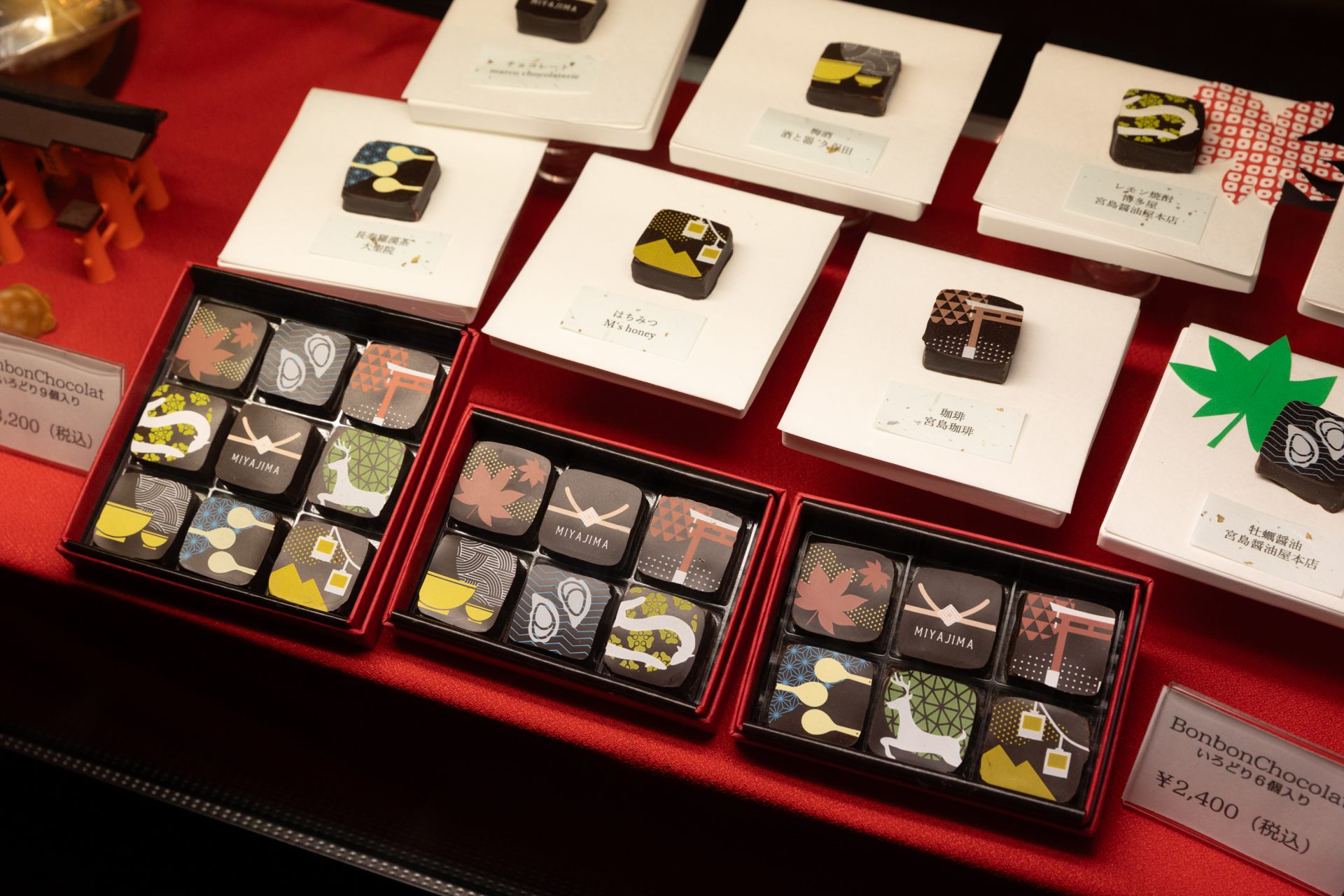 ここでも注目のおみやげを発見!それは、okeiko japanオリジナルの「宮島チョコレート」。牡蠣醤油やレモン焼酎といった広島県内の名産品の味に、しゃもじや鳥居などのモチーフが描かれたチョコレートは全9種類。広島の人気ショコラトリーの協力を得て開発されたもので、6個入り2400円、9個入り3200円と2サイズ用意されているので、ぜひ宮島みやげとしてお持ち帰りしてください♪