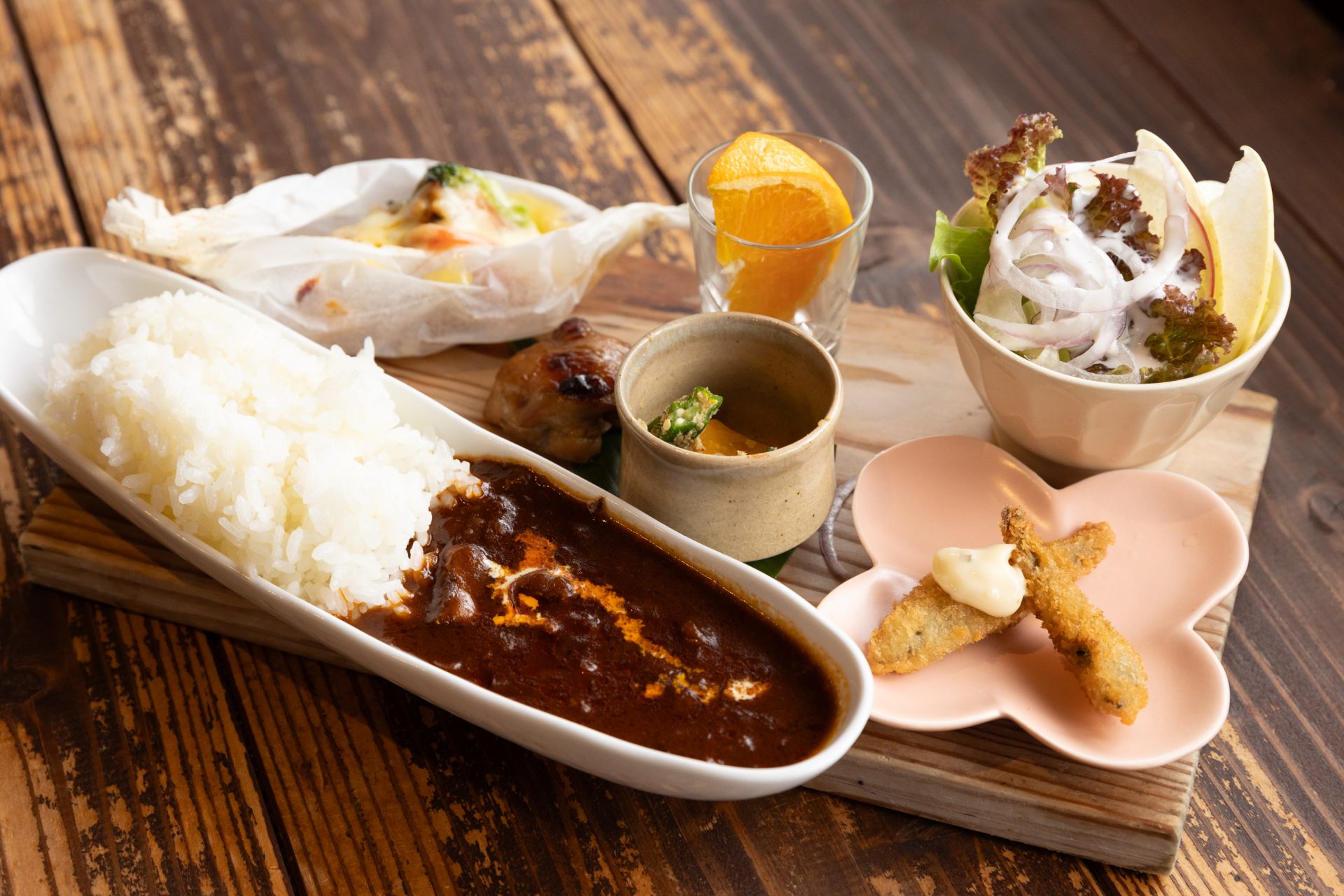 たくさん歩いたあとは、お腹ペコペコ!町並み地区に戻ってきたら、Café住留(ジュール)でランチをいただきましょう。ここは築100年の古民家を活用したカフェレストランで、地元の野菜を使った料理を楽しむことができます。この日は数量限定の「ジュールランチ」を注文。柔らかく煮込んだ牛すじがたっぷり入ったハヤシライスに、付け合わせのサラダや小鉢など盛りだくさんの内容です!牛すじトロトロハヤシやハンバーグカレー、カツカレーなども人気。食後には温かいドリンクを飲んでひと息つきましょう。