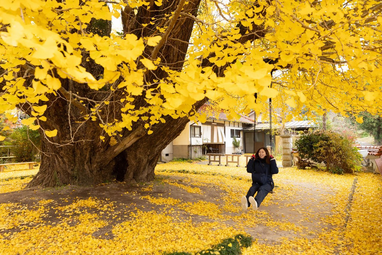 サイクリングでぜひ訪れてほしいスポットが浄善寺。境内にある大イチョウの木は秋になると黄金色に美しく色づき、多くの人々が訪れる隠れた穴場スポットなんです。例年見頃を迎えるのは11月中旬から12月上旬。木にはブランコがあり、童心に帰ったつもりでこんな素敵な写真が撮れますよ。公共交通機関ではアクセスしにくい場所に位置していますが、さんべ荘では自転車レンタル(要事前予約)のみも受け付けているので、お寺に行くだけでも利用する価値あり!