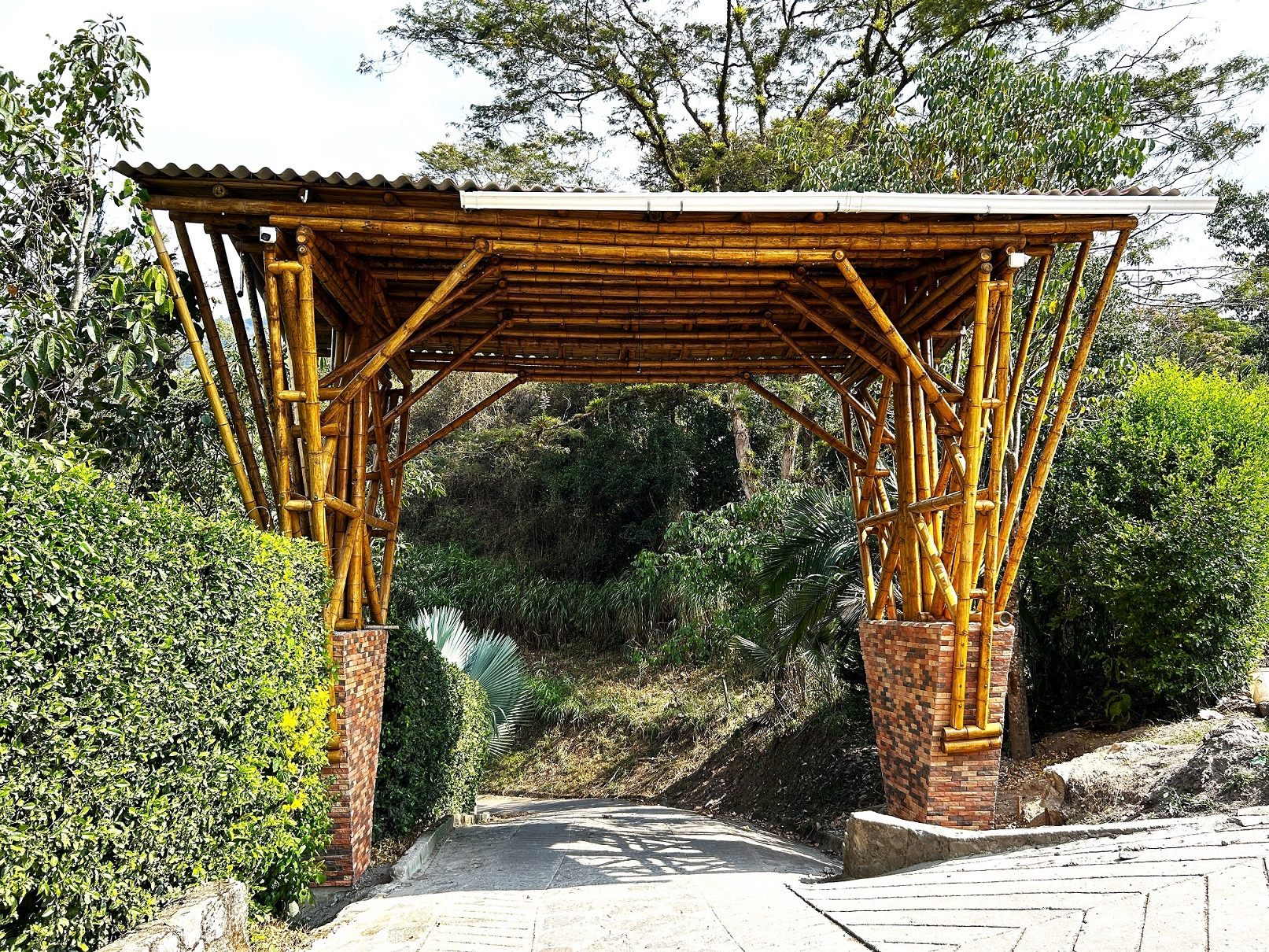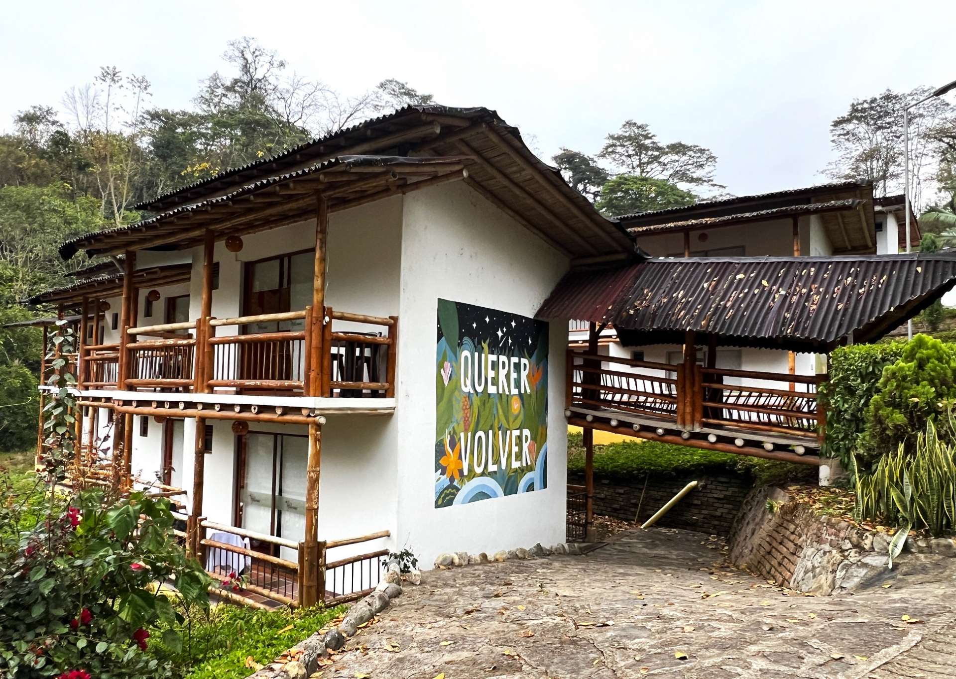 セタキラ村へ向かう未舗装路を走り、村まであと2kmという場所で、宿の看板に従って左折します。その後はムエチェ川沿いまでひたすら坂を下ります。ボゴタ空港から約6時間、太い竹を組んで作られた門をくぐると宿に到着です。