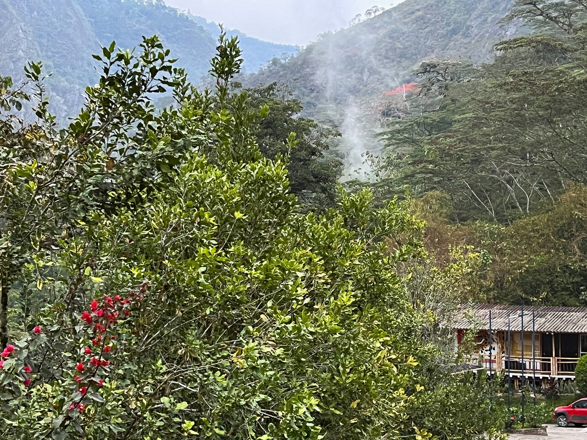 部屋の窓から、遠くに湯けむりが見え、あれが湯滝に違いないと気持ちが高ぶります。標高は1380mまで下がったので、息苦しさは感じません。
