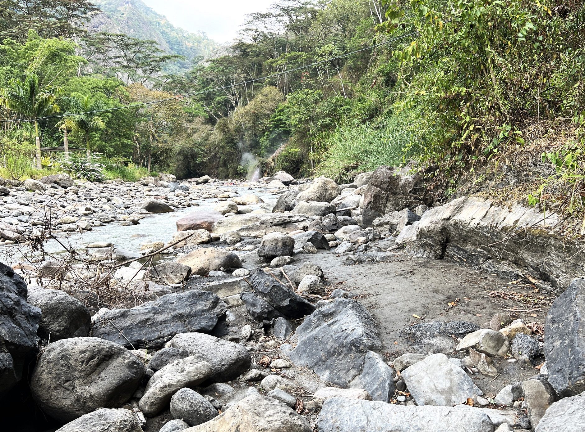 さっそく、湯滝へと向かいます。レセプション脇の坂を下ると、分岐があり、左手は宿の温泉プールに、右手はムエチェ川に通じているようでした。竹垣に囲まれた道を下って川岸に出ると、200~300mくらい先に噴煙が見えます。川原か川中を歩いていくものと考えていましたが、まもなく山側に古タイヤを埋め込んだ道が現れるので、そこを進んでいきます。