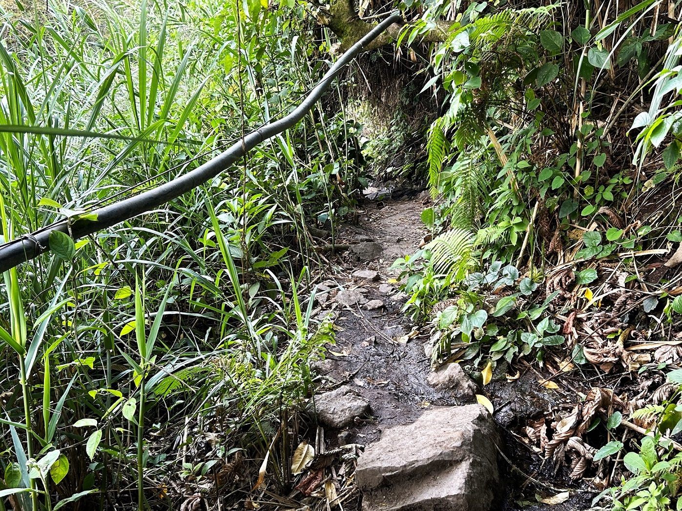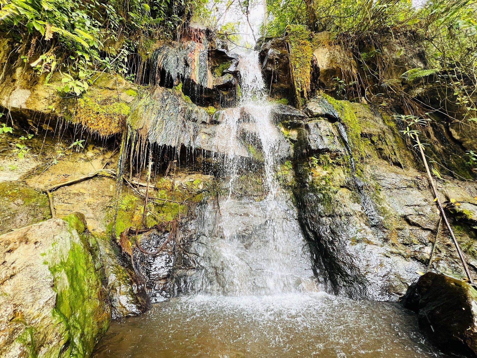 岩場伝いに滝を越えて、山道を歩きます。道に沿うように黒い塩ビパイプが通っていて、目指す湯滝からホテルまで湯を運んでいるようです。まもなく、小規模な温泉の湧出地帯が何ヵ所も見えてきました。事前に読んだ文献には「32ヵ所の源泉がある」と記されているので、おそらくこれらの小源泉も含んでいるのでしょう。一般の人から見ればただの茶色い水でしかないかもしれませんが、筆者にとってはクライマックスが近づいているのを知らせる兆候で、気持ちが高揚します。