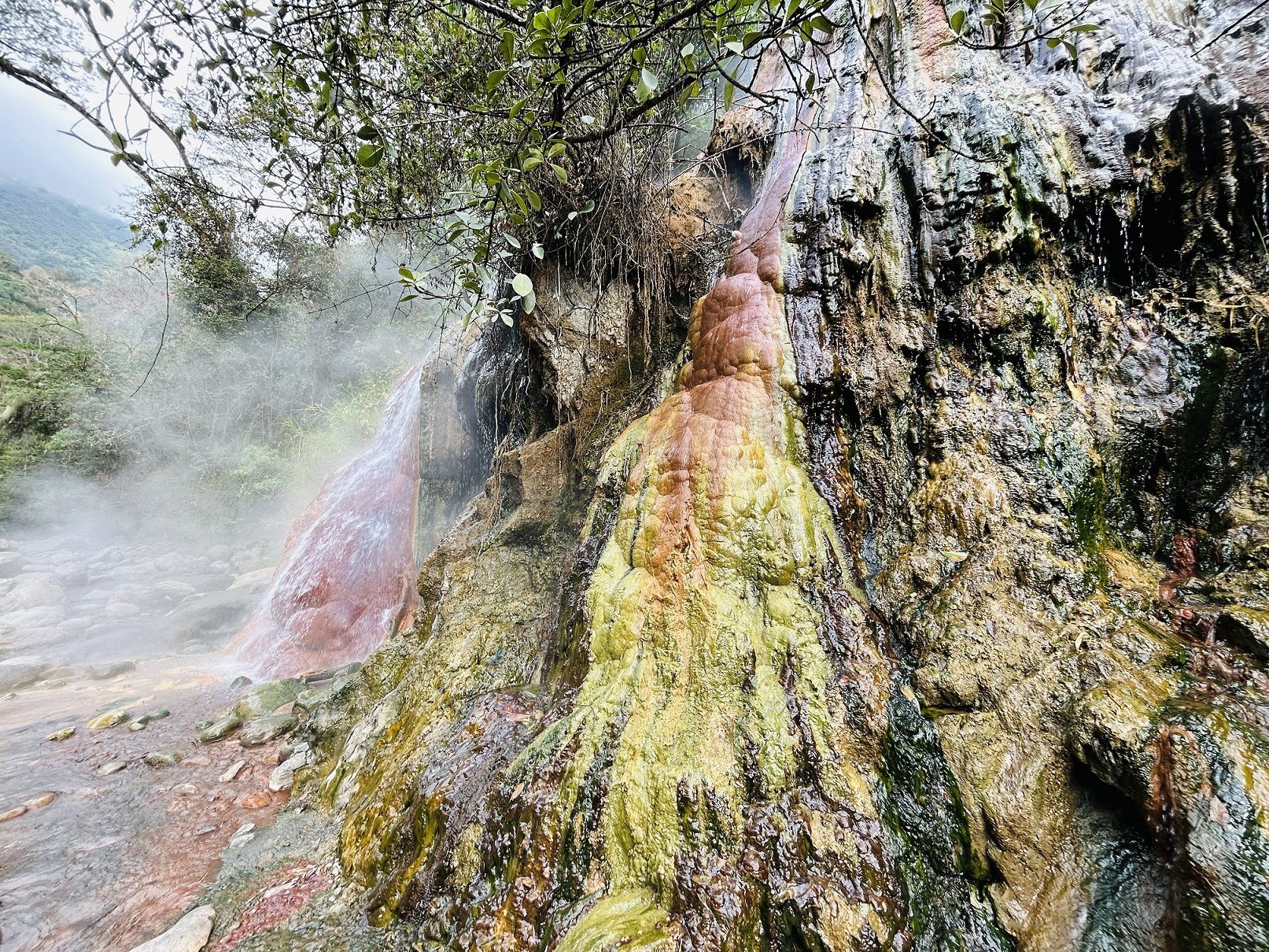 滝の流れる岩壁は鮮やかな赤・黄・緑の縞模様。アフリカ諸国の国旗やレゲエファッションで有名なラスタカラーを思わせる色合いに興奮が高まります。味やニオイはほとんどありませんが、炭酸カルシウムを豊富に含むため、分厚い石灰華ドームを形成しています。世界各地で湯滝を訪ねてきましたが、湯温と鮮やかな色合いでは屈指のものです。湯滝の頂上には2本のパイプが突き刺さっており、エリコニアス温泉と対岸のもうひとつの宿に温泉を運んでいます。