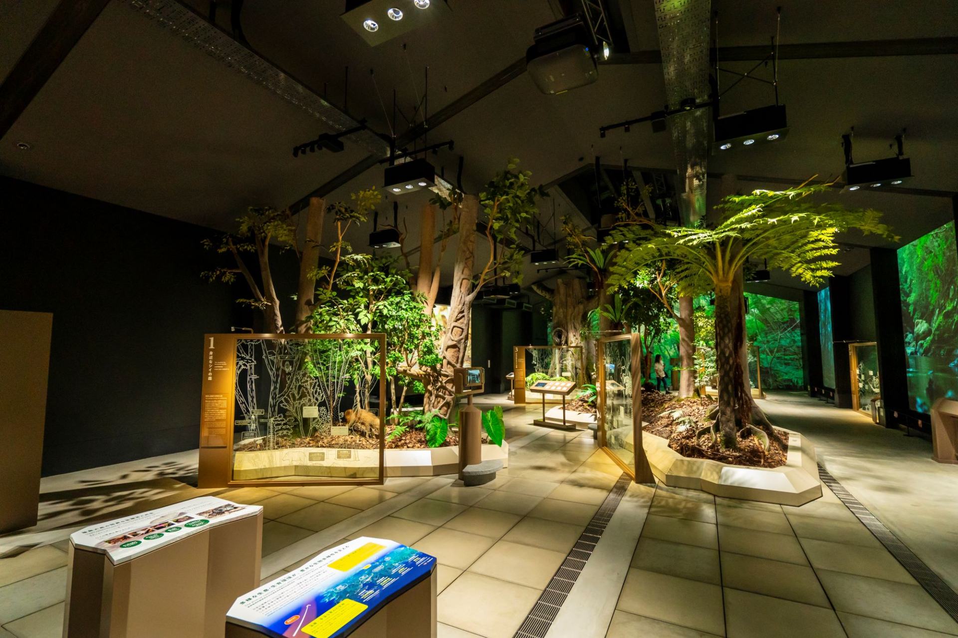 奄美大島観光に出かける際、まず訪れてほしいのが島の真ん中あたりに位置する「奄美大島世界遺産センター」。ここで事前に知識をインプットしてから山や海のアクティビティに出かけるのがおすすめです。2022年7月に開館した奄美の自然について学べる施設で、館内には奄美の自然が巨大なスクリーンやジオラマなどを用いて臨場感たっぷりに展示されています。フィールドスコープをのぞいて森に潜む動物を発見したり、降り注ぐ雨の音や鳥のさえずりに耳を澄ませたりと、本当に奄美の森を探検しているみたい。自然について学べるだけでなく、時間とともにうつろう森の美しい景色も見所です。