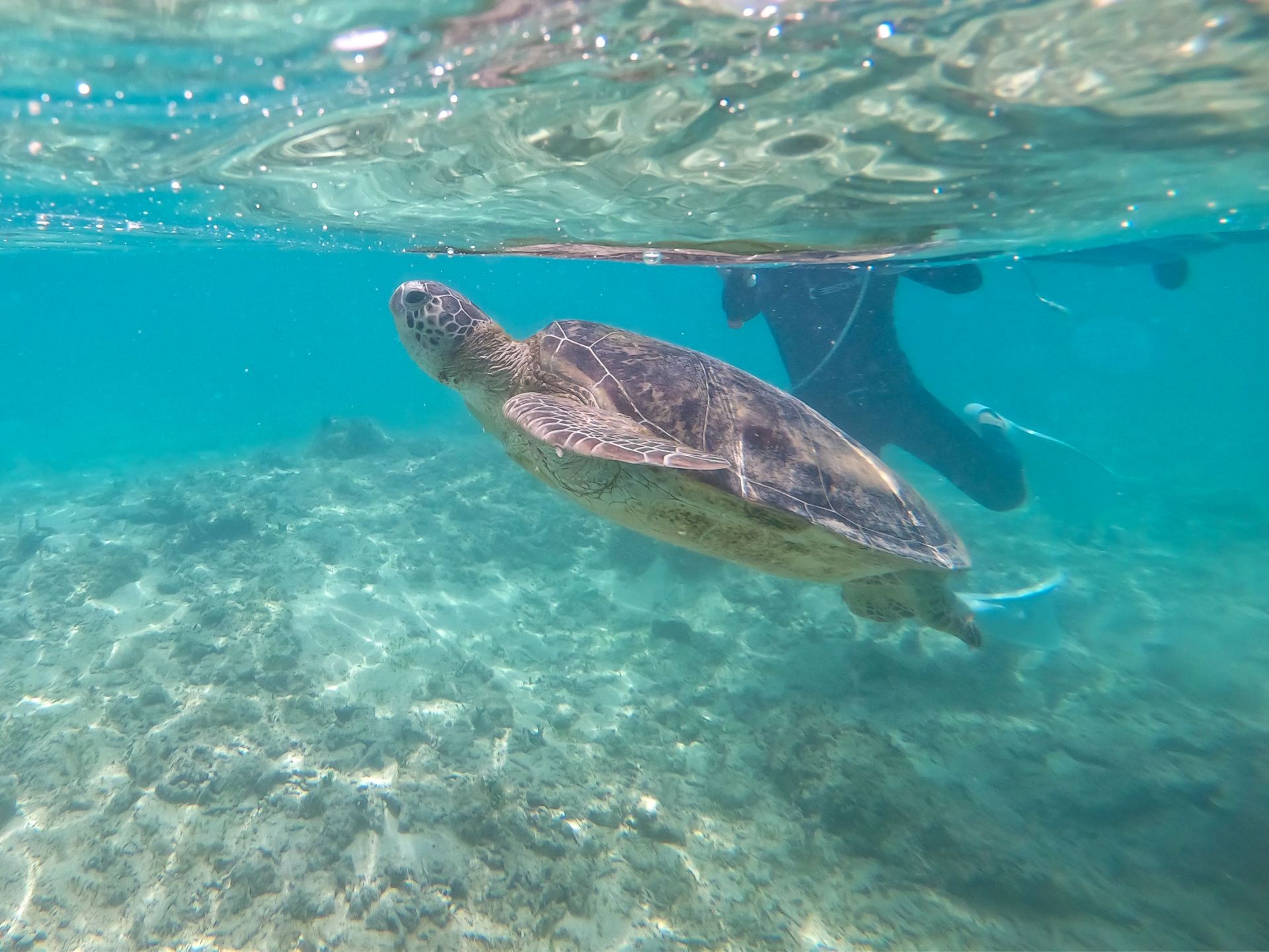 ツアーにはウエットスーツやスノーケリングギアが含まれているので水着だけで参加OK。スノーケリングの基本を学んだら、いざ、海へ。しばらく浅瀬をスノーケリングしていると、早速ウミガメ発見! 驚くほど近くを悠々と泳ぐ姿に感動です。