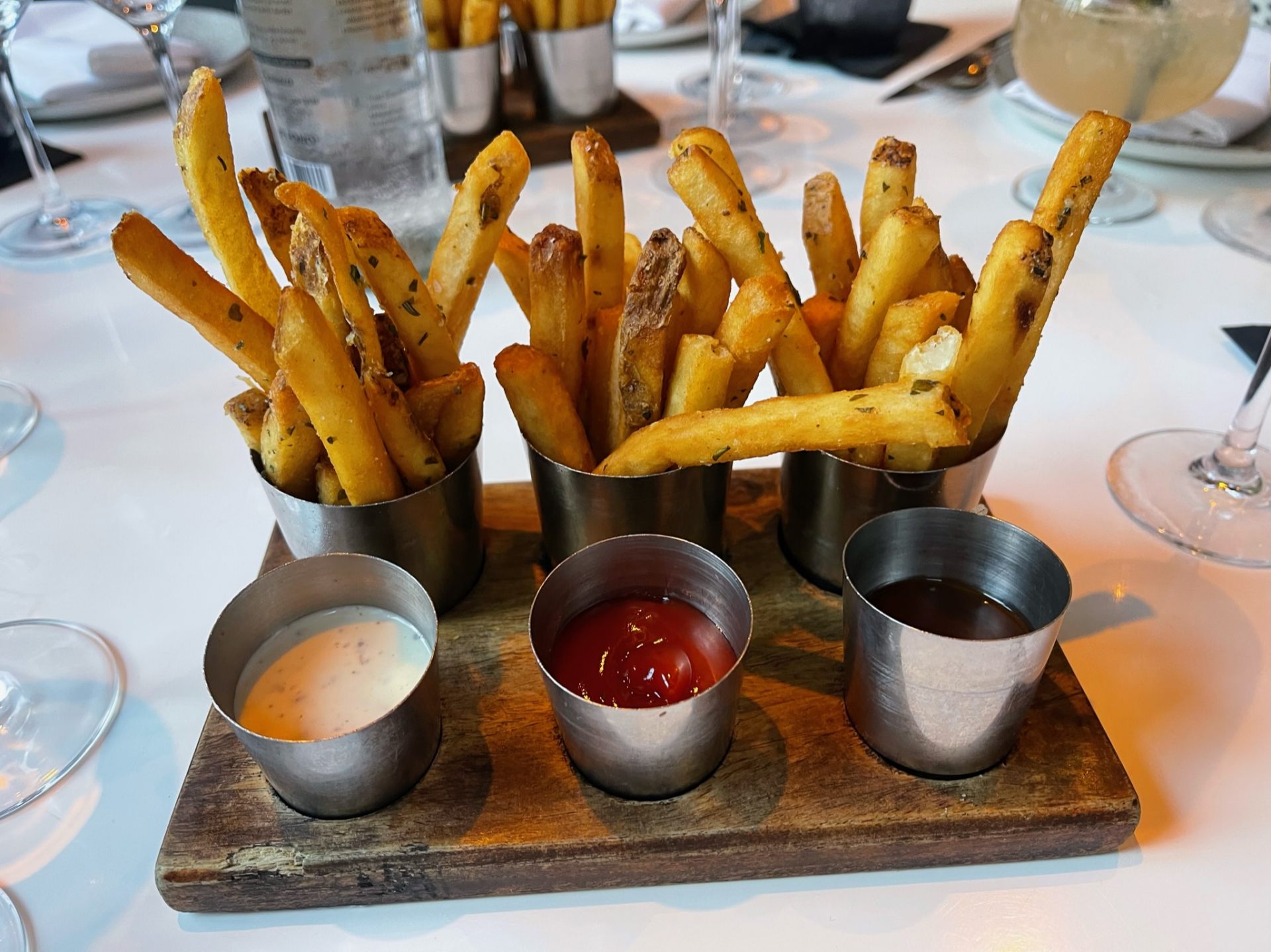 そうそう、最初にサーブされるサービスのフレンチフライ。 実はこのメニューには多くのファンがいるんです。その理由のひとつがソース。アイオリ、ケチャップ、トンカツソースの3種がついてきます。「フレンチフライにトンカツソース?」と最初は驚きましたが、ありです。私がいちばん好きなのは、アイオリ!