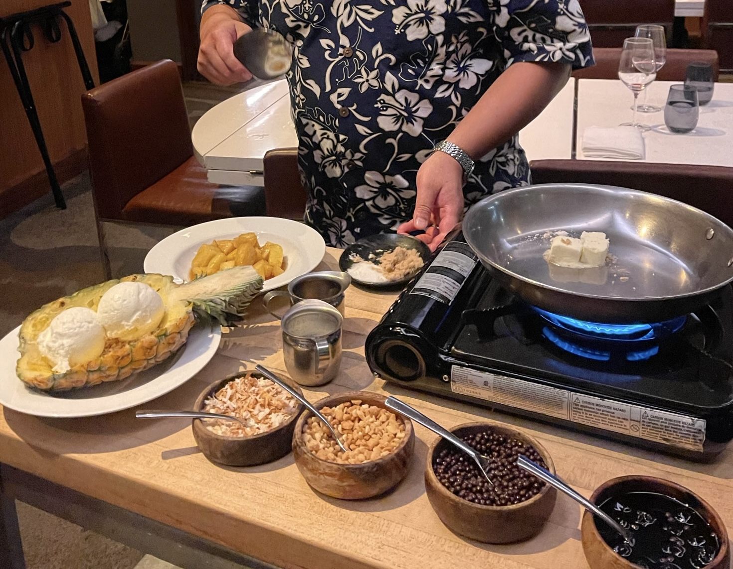 そして最後は、 テーブルサイドで作ってもらえる「Pinapple Foster」。こちら、パイナップルをくり抜いた容器にフランベしたパイナップルやアイスクリームを盛りつける、ハワイらしいスペシャルデザートなんですよ。炎があがるパフォーマンスに、子供も大人も大盛り上がり!