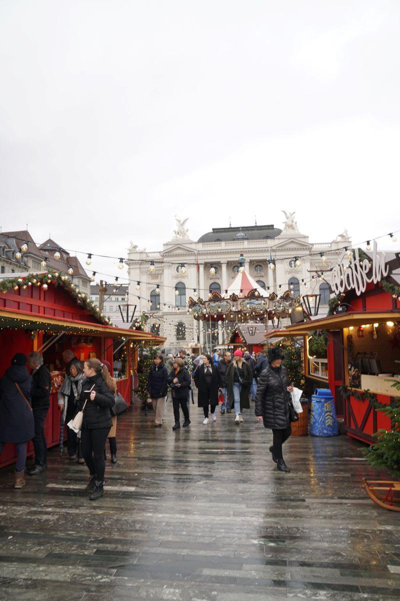 次の日には昼のマーケットの様子も見ることができました。回ったのは前日散策したチューリッヒ中央駅~リンデンホフとリマト川を挟んだ向かいのエリア。チューリッヒ歌劇場横のSechseläutenplatzにあるクリスマスマーケットです。チューリッヒ湖畔に広がる開放感のある広場でとても気持ちがよかったです。
