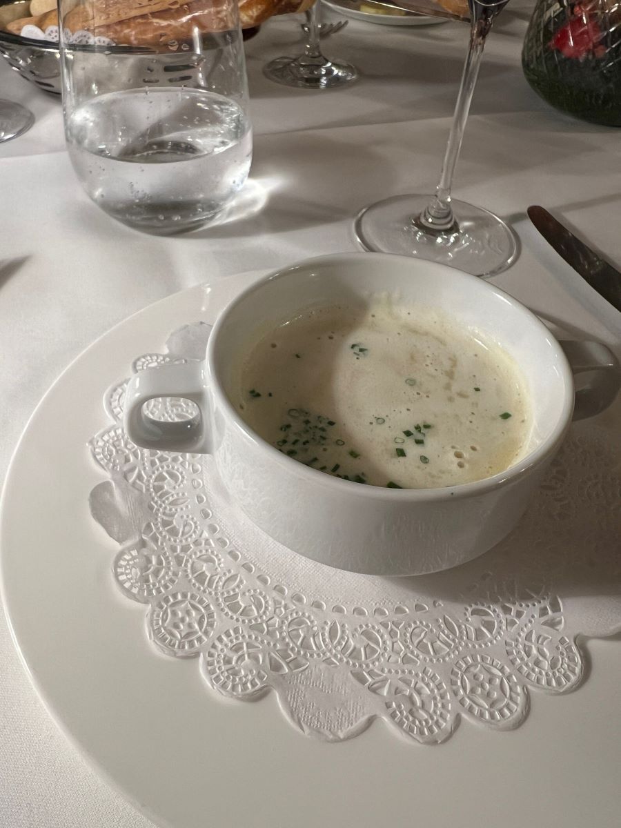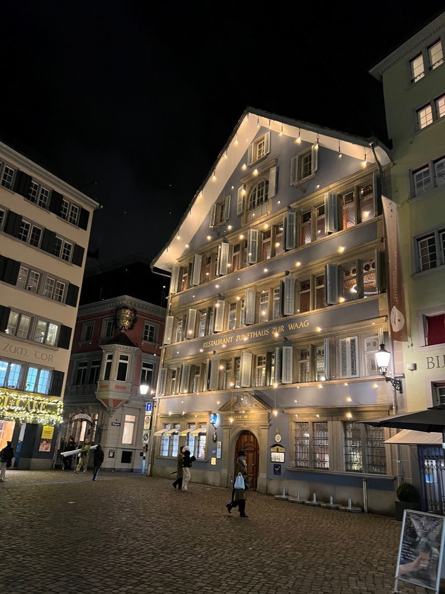 この日の夕食はマーケットの横にあるツンフトハウス・ツァ・ヴァーグ Zunfthaus zur Waagにお邪魔します。ツンフトハウスとは元々ギルド(ヨーロッパの職業組合)であったことを示しており、ヴァーグ(天秤)とはそのギルドが建物を所有する前、フラウミュンスターの医師が所有していたころの通り名がそのままギルドの名前として残ったという歴史があるそう。これらは14~15世紀ごろのエピソードだそうで、ちょっと背筋が引き締まります。レストランスタッフのエスコートも素敵でクラス感が漂います。