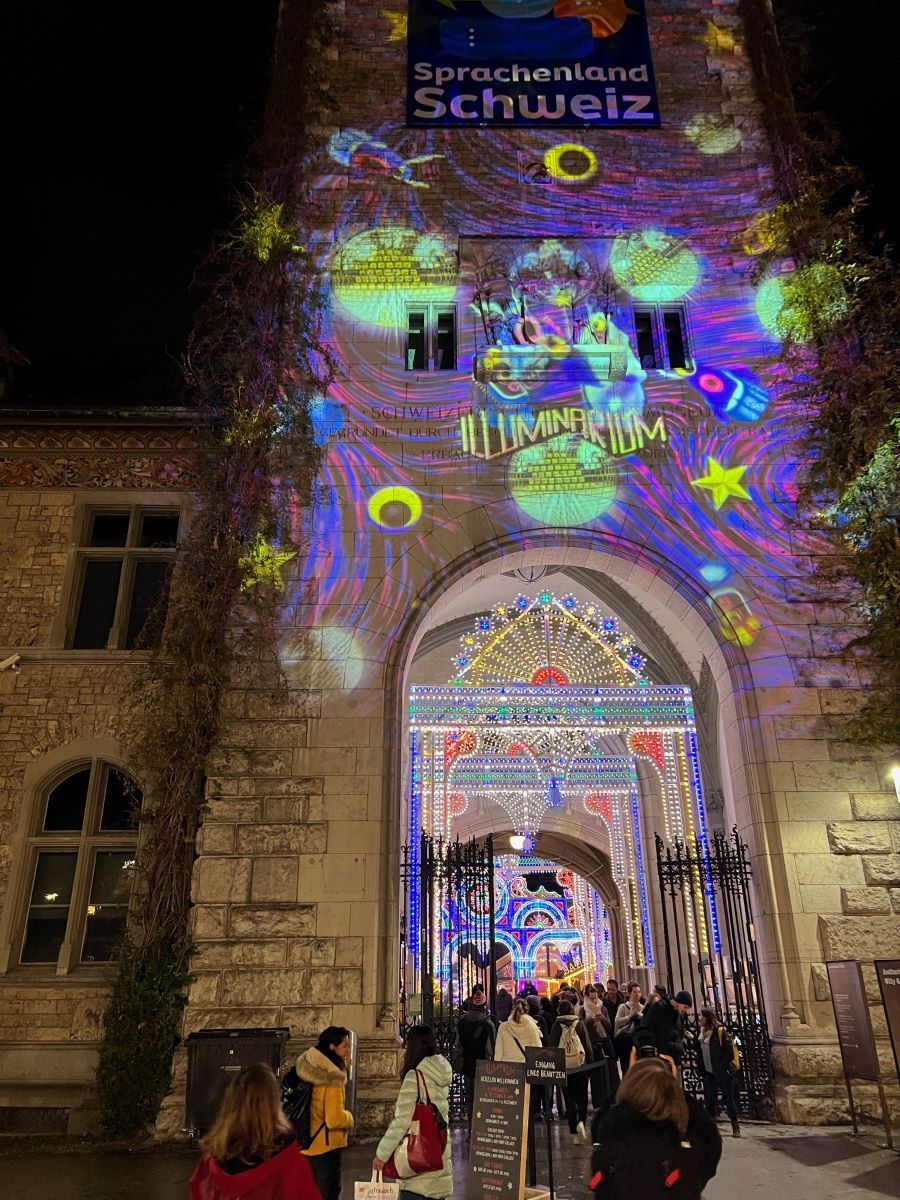 おいしい夕食もいただいて夜も9時を過ぎ、後はホテルに帰るだけ…と思いきや、まだまだ街はにぎやか。最後はチューリッヒ中央駅へ取って返し、駅前の国立博物館の敷地で行われるライトアップイベント・イルミナリウム illminariumへ向かいます。