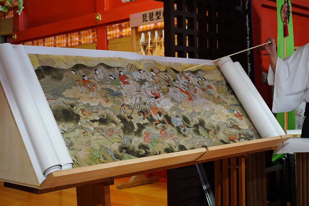 江島神社では、神職さんから江島縁起絵巻の解説をしてもらいました。江島縁起絵巻とは、五頭龍の伝説や江の島の由来をまとめたもので、普段は宝物として神社に保管されています。その伝説によると、むかしむかし、鎌倉で悪行を重ねていた五つの頭をもつ龍のもとに、天女が舞い降りて諭したといいます。天女の天下りとともに出現したのが江の島で、天女に恋心をもった龍は改心し、村人たちに感謝されるまでに。その後、山に姿を変えたといいます。その山が現在の藤沢市龍口山だそう。