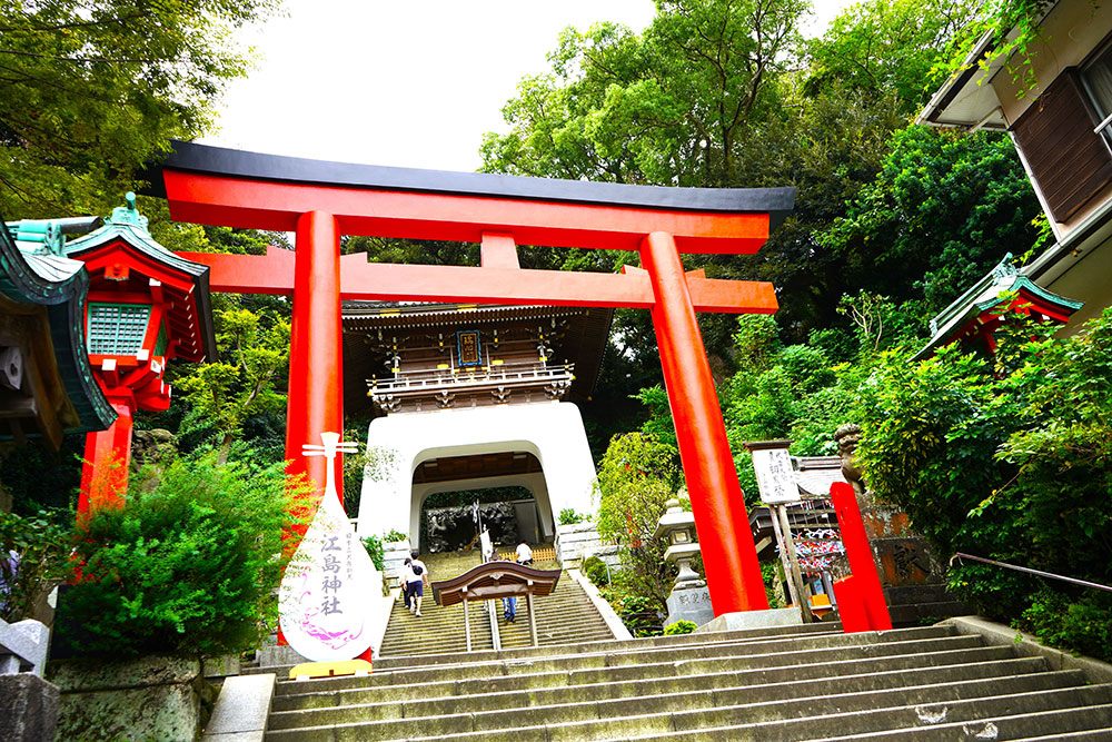 それではガイドツアースタート!小田急線片瀬江ノ島駅方面から江の島弁天橋橋を渡る手前で目に飛び込んでくる龍燈籠は、江島神社の鎮座を記念して2001年に建てられたもの。橋を渡ったら江の島弁財天仲見世通りを過ぎて、そのまま屋外エスカレーター「江の島エスカー」で江島神社へ。