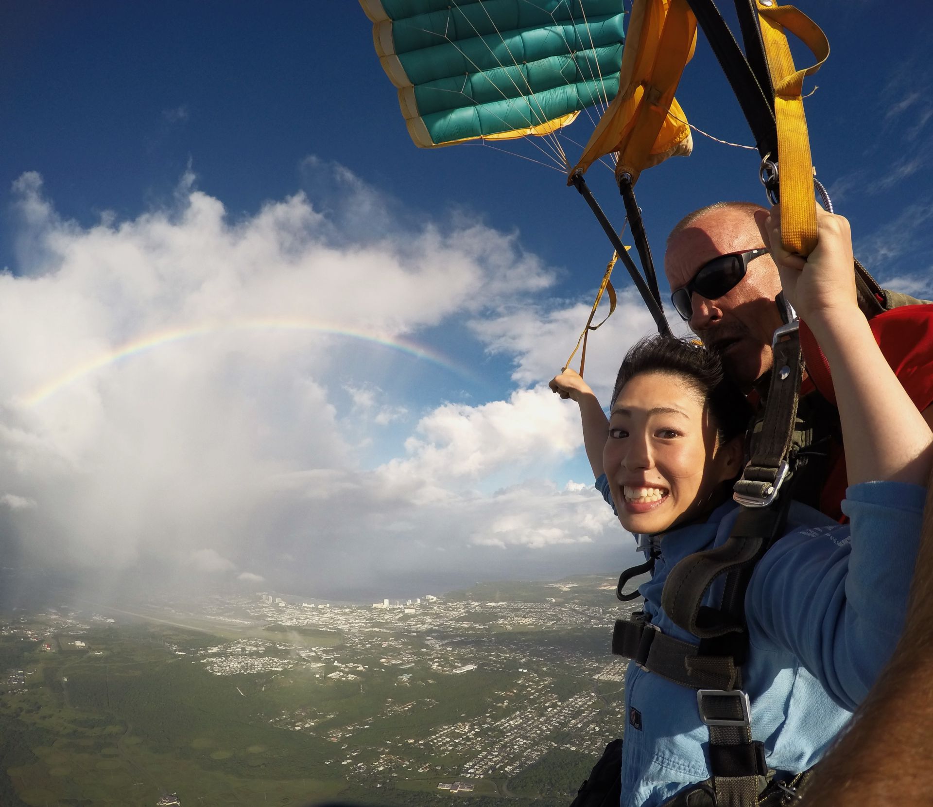 スカイダイブ・グアムで採用しているのは、1つのパラシュートで熟練インストラクターと一緒に飛ぶタンデムスカイダイビング。パラシュートの展開や操作はすべてインストラクターがしてくれるので、参加者はただリラックスして風に身を任せ、エキサイティングな時間を楽しむだけ。インストラクターは空中で写真を撮ってくれるので笑顔を忘れずに。