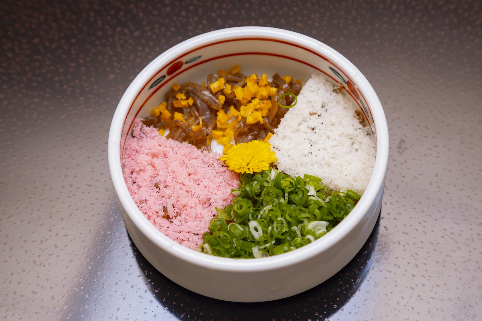 色鮮やかなこちらの料理は、愛媛県宇和島市に伝わる行事食「ふくめん」。食べやすい大きさに切った糸こんにゃくの上に白とピンクのそぼろ、ネギ、ミカンの皮をのせたもので、4色で四季を表現しているのだそう。名前の由来は「山ふく」(=こんにゃく)を麺のように細く切るからとも、そぼろで“覆面”するからともいわれています。