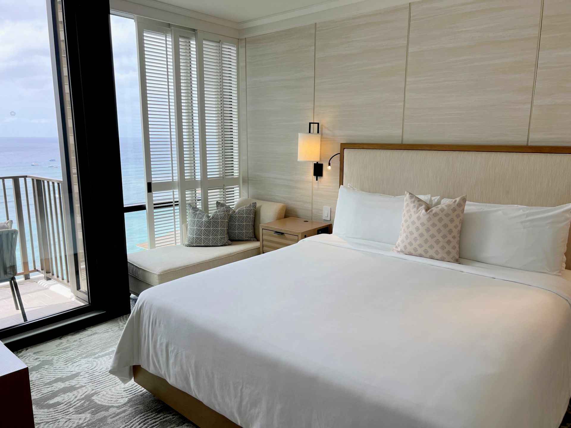 白、水色、ベージュで整えられた客室は清潔感いっぱいで、柔らかな色合いが目に優しく映ります。今回滞在したのは、23階のデラックスオーシャンビュー。眼下にはハレクラニの象徴でもあるオーキッドが揺れるプール越しに、ワイキキビーチの眺望が広がります。さらに視線を移せば、アラワイヨットハーバーからアラモアナビーチ、その向こうに広がるオアフ島西部の山影までぐるりと見渡せます。シンプルなインテリアと控えめな色合いは、ラナイから広がるこの眺めをより楽しむためのものだと気付かされました。