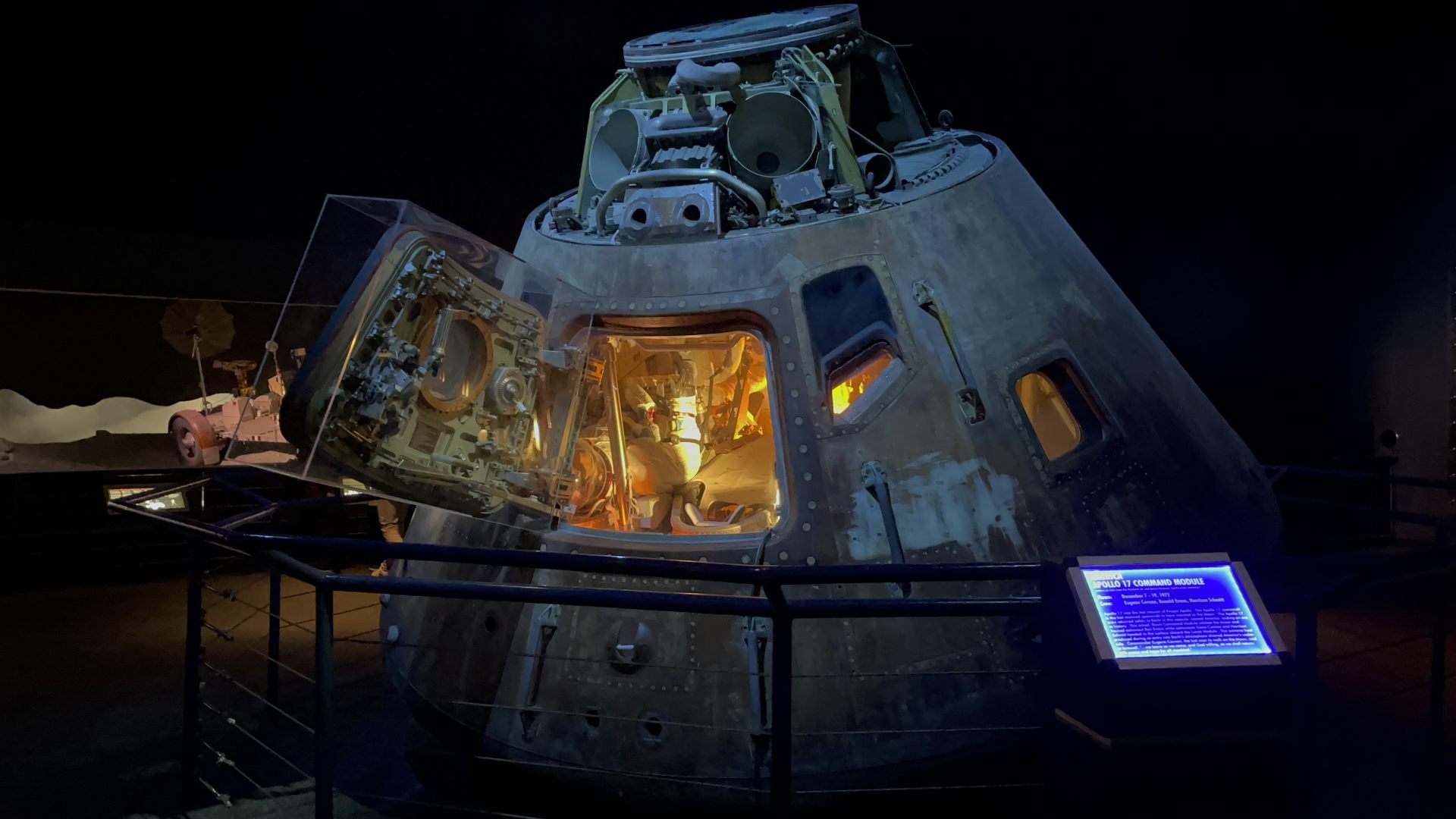 宇宙飛行士3名を月から地球へ帰還させるために造られたこのカプセルでは、地球の大気圏を通る際、高温にさらされ焦げた状態を見ることができます。またカプセルの中も見られるため、どのくらいの空間に宇宙飛行士3名が乗って地球へ戻ってきたかを知ることができます。