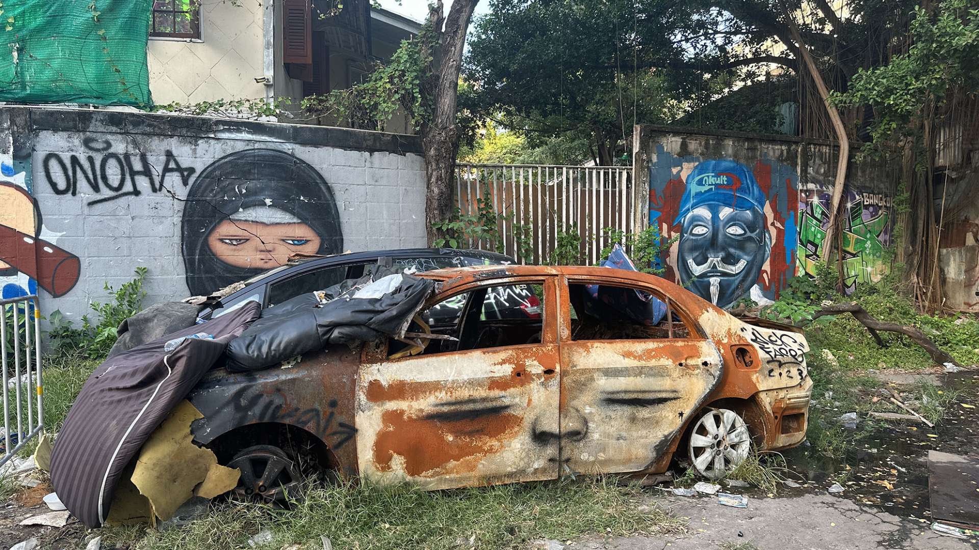 運河沿いにある「Jee Nee Thaiレストラン」の隣の空き地に入ると…ここでも「マルディ」を発見! 近くにあった廃車にグラフィティアートを描こうというアレックスのアイデアで、未來さんが初めてのグラフィティに挑戦。2人の思い出の共同作品が完成しました!