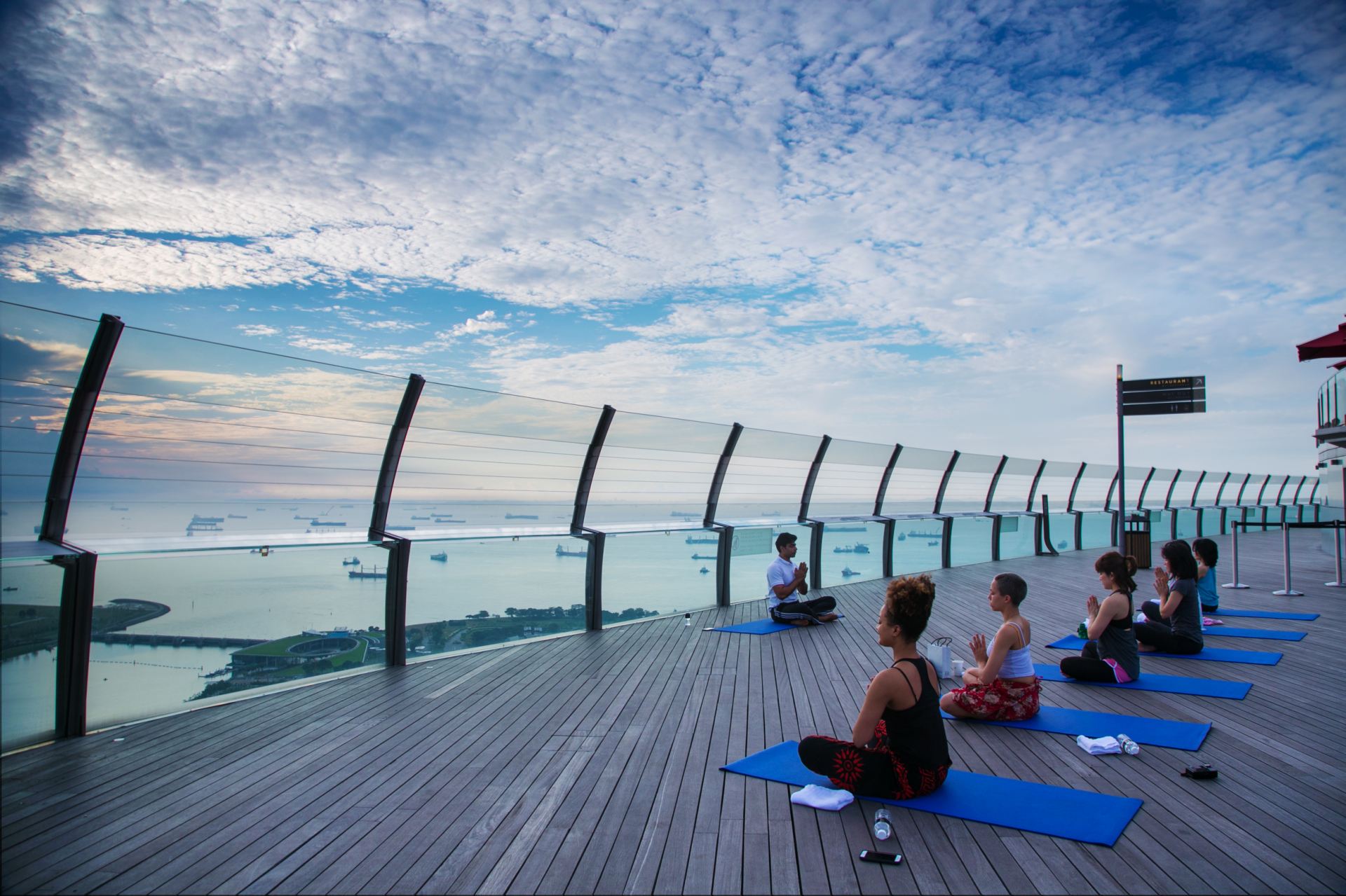スカイパークの突端にある展望デッキにはぜひ上ってみたいものです。天空からの景色を楽しむだけでも感動的なのですが、さらに特別な体験もできちゃいます。それは日の出とともに行われるヨガのプログラム。大都会の絶景と海景色を望みながら静寂と清々しい空気のなかでのヨガ体験は、爽快かつ味わったことのない浮遊感に包まれます。