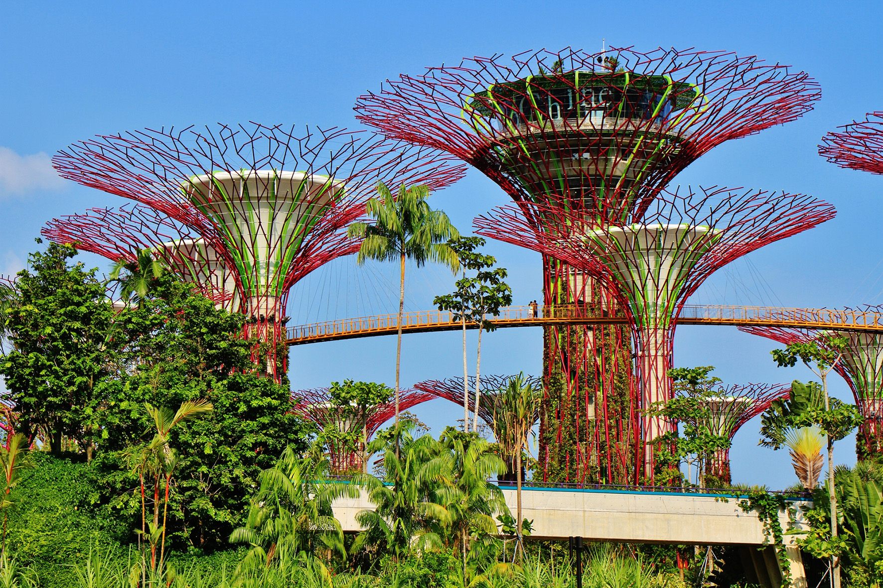 スーパーツリーは空中散歩も楽しめるアクティビティに。2本のツリーを結ぶ高さ22mのつり橋「OCBCスカイウェイ」が設置されていて、ちょっぴりスリルを感じつつツリーの森を一望できます。最も高い50mのスーパーツリーの頭頂部にあるオブザーバトリー(展望台)には、シンガポールの著名なショコラティエ、ジャニス・ウォンのカフェがあり、眺めを楽しみながらスイーツでブレイクタイムを。