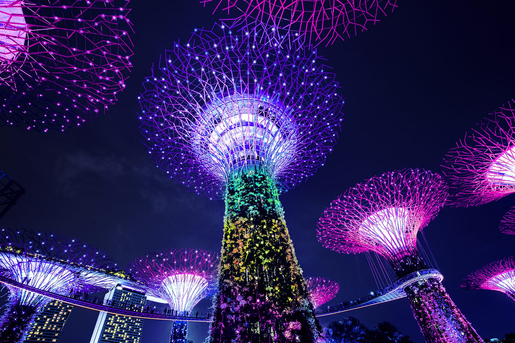 まずはSF世界を思わせるスーパーツリーのエリアへ。計18本の人工ツリーが建ち並ぶ光景は圧倒的迫力。よく見るとこのツリー自体が「庭園」なのです。幹に取り付けたパネルにランやシダ、パイナップル科などの植物が植え付けられていて成長を続けています。