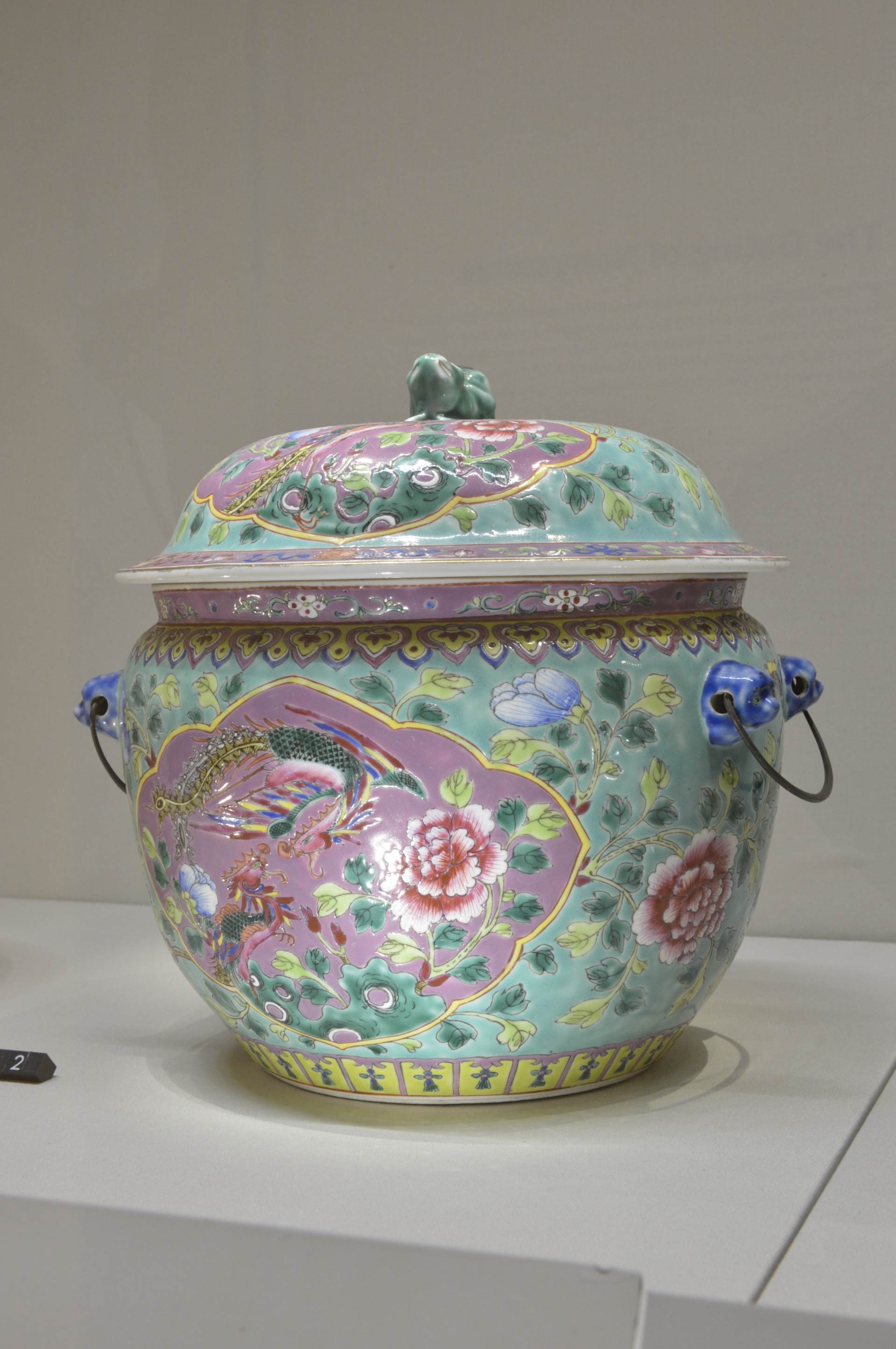 さらにプラナカンの美意識は陶器にも表れています。ニョニャウエアと呼ばれるプラナカンの陶器は、ピンクとターコイズブルーをはじめ、パステルカラーが主流。鳳凰と牡丹がシンボル的モチーフで、中国の景徳鎮で焼かれたものが主流。この陶器はおもに結婚式や祭事、来客のもてなし用に使われたそうです。