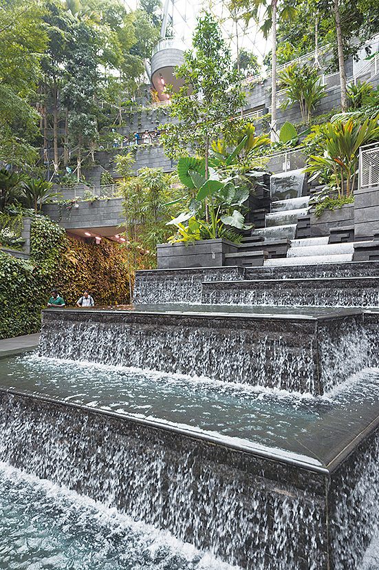 施設の核となるのが、天井から流れ落ちる滝「レインボルテックス」です。その高さは40mあり、室内の滝では世界一を誇ります。夜はライトアップされ、ひときわ幻想的に! 光と音楽がシンクロするショーも開催されます。この滝を取り囲む「フォレストバレー」と名づけられた熱帯雨林の森は、2000本以上のヤシや高木が植えられ、その規模に驚くはず。豪快に流れ落ちる滝は迫力満点です。Leve1からLevel4まで階層状にせり上がっていて、設置された遊歩道を散策し、思い思いの場所で、滝ビューを楽しみ写真撮影に夢中に。