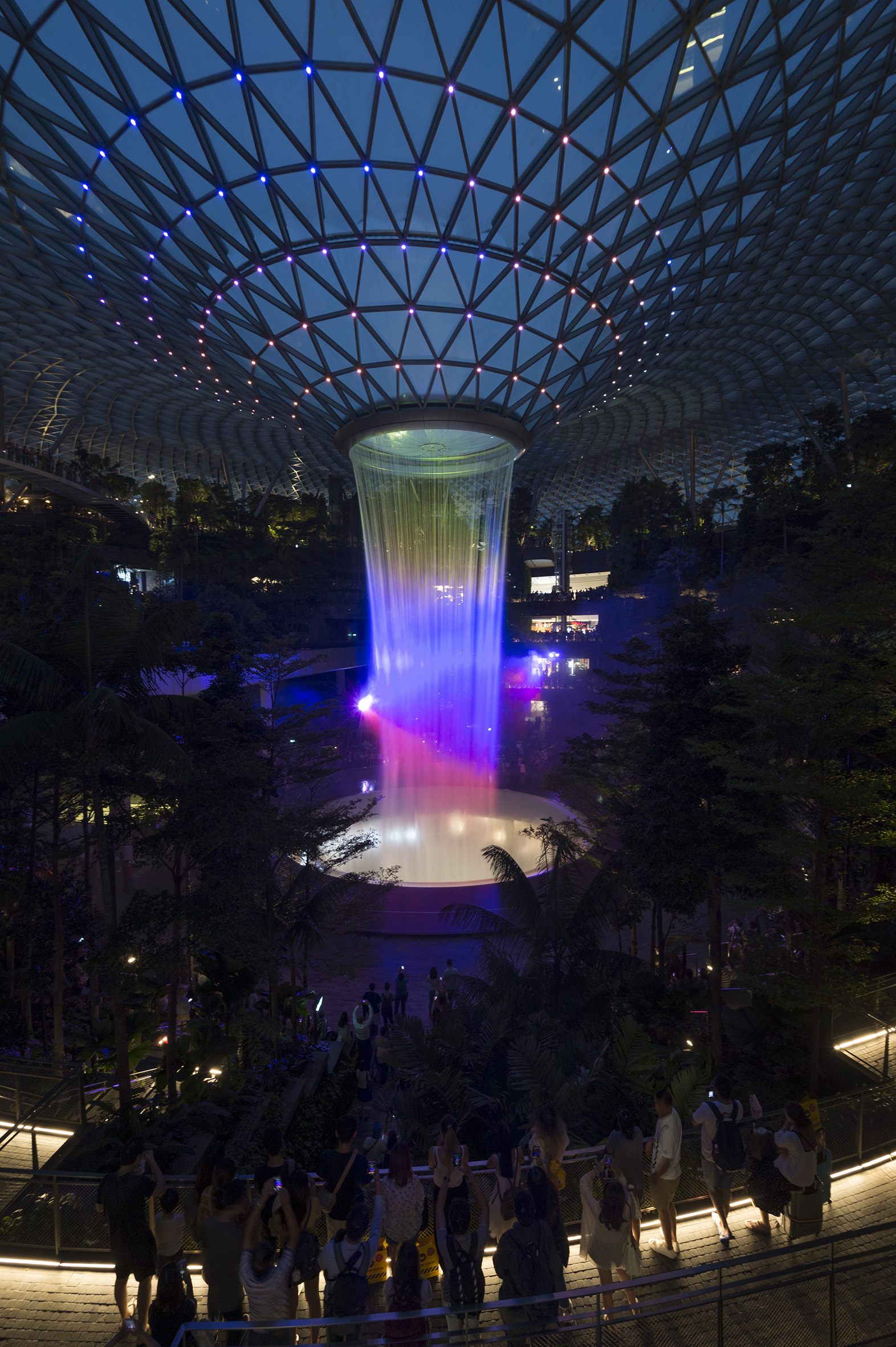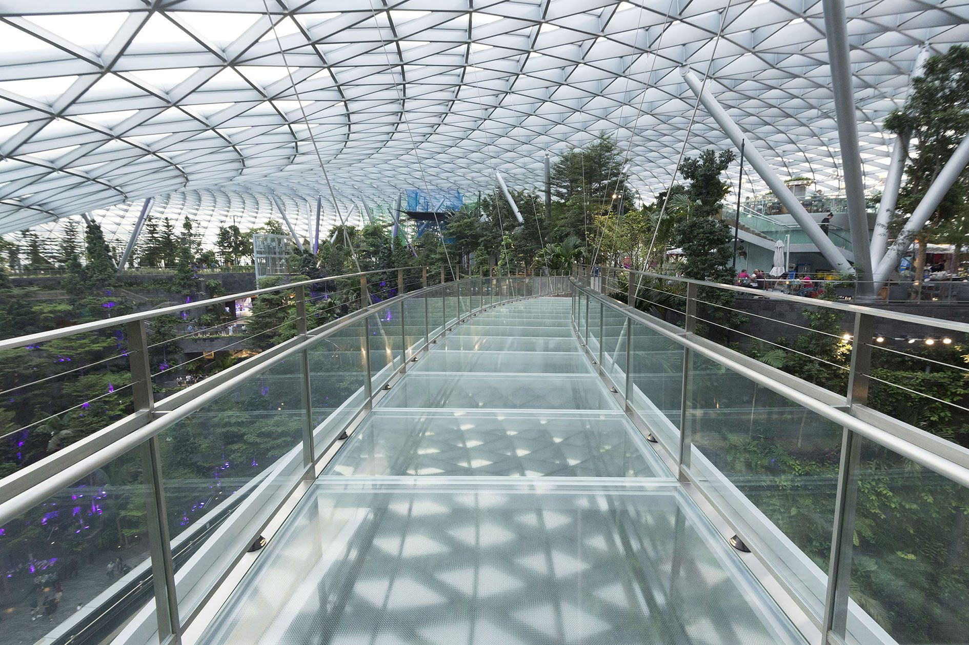 ジュエルは、2019年に開業した大型複合施設。天空のプールで有名なマリーナベイ・サンズも手掛けたモシェ・サフディ氏が「魔法の庭園」をテーマに設計したガラスと鉄骨でできたドーム型の建物内は、地上5階、地下5階(うち地下3~5階は駐車場)の構造。